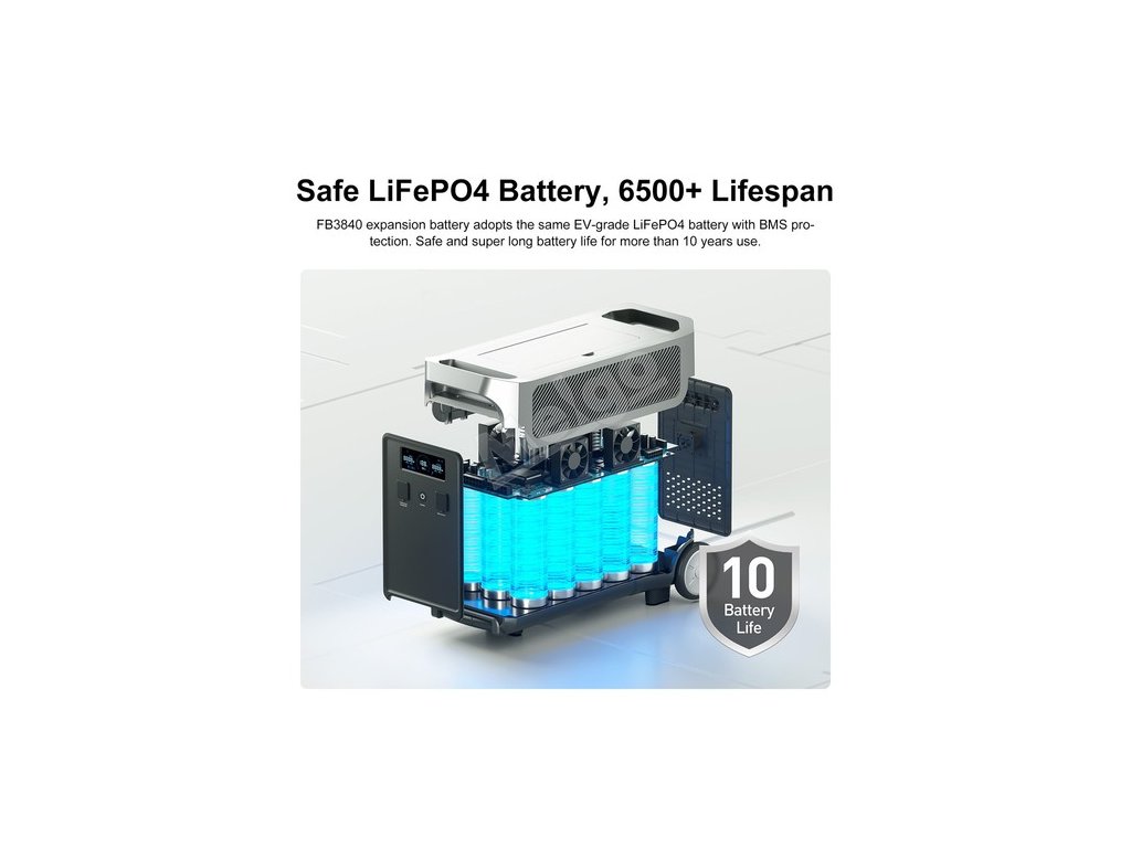 Rozšiřující baterieFB3840 používá stejnou baterii LiFePO4 třídy EV s ochranou BMS. Bezpečná a super dlouhá životnost baterie pro více než 10 let používání.
