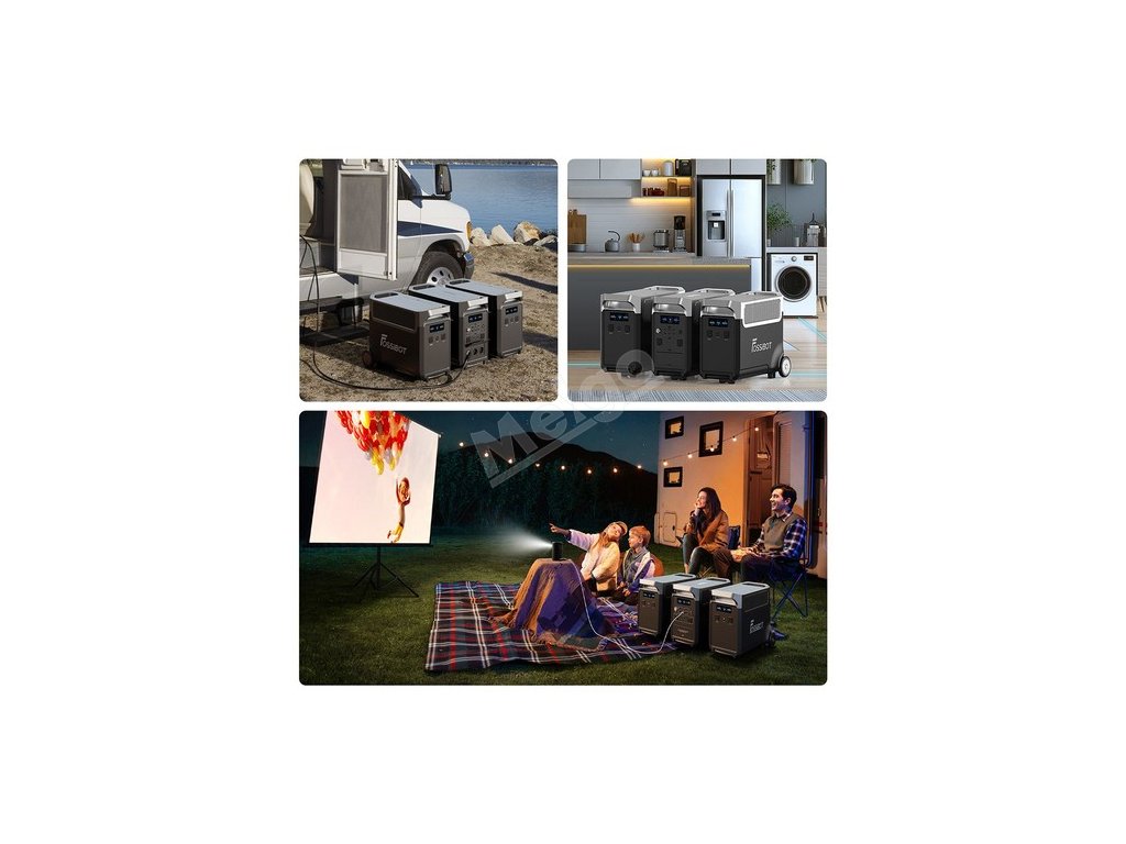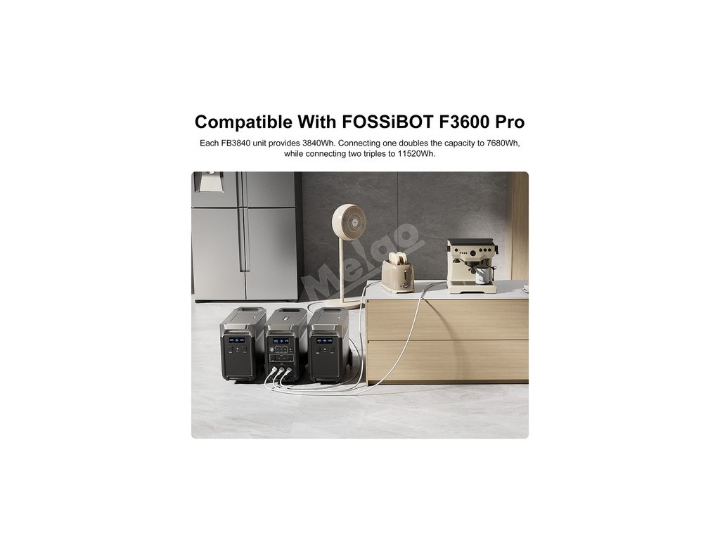 Každá jednotka FB3840 poskytuje dodatečnou kapacitu 3840 Wh. Připojením jedné jednotky FB3840 se celková kapacita zdvojnásobí na 7680 Wh a připojením dvou jednotek se ztrojnásobí na 11520 Wh. To zajišťuje několikadenní výdrž baterie pro základní spotřebiče s FOSSBOT F3600 Pro.