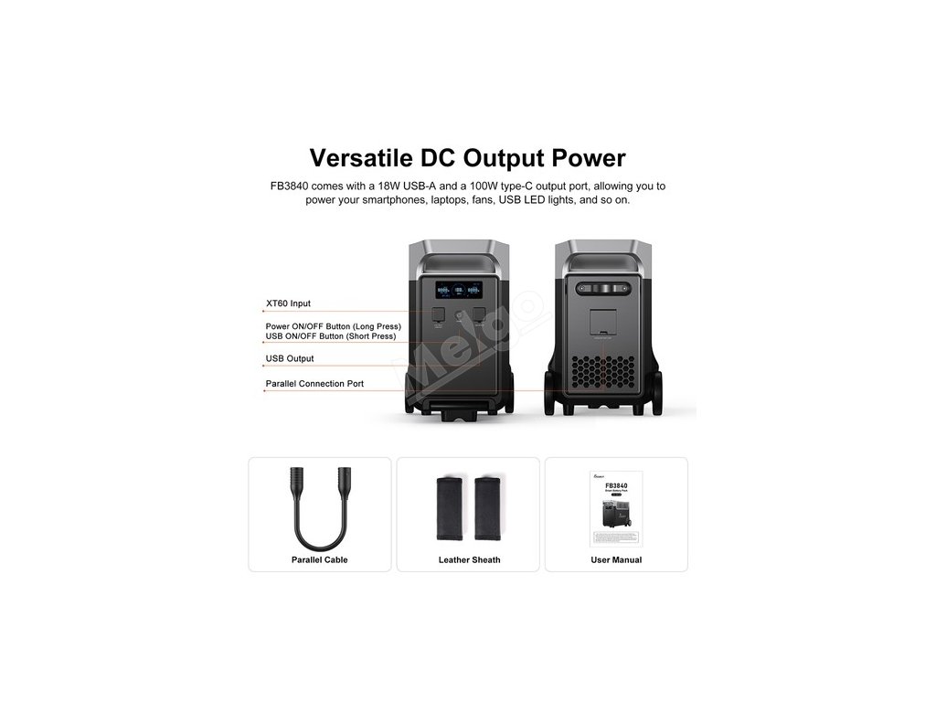 Model FB3840 je vybaven 18W výstupním portem USB-A a 100W výstupním portem typu C, což umožňuje napájet chytré telefony, notebooky, ventilátory, USB LED světla atd.