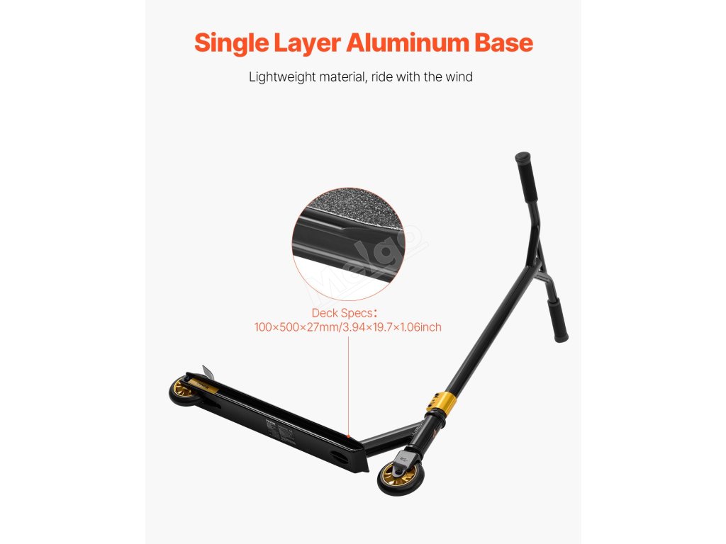 Jazdec na freestylovej kolobežke používa prémiové materiály: odolnú, ľahkú jednovrstvovú palubu z hliníkovej zliatiny 6063 s protišmykovou povrchovou úpravou paluby, ktorá zabezpečuje pevné uchopenie nohy počas vysokorýchlostnej jazdy alebo kaskadérskych kúskov.