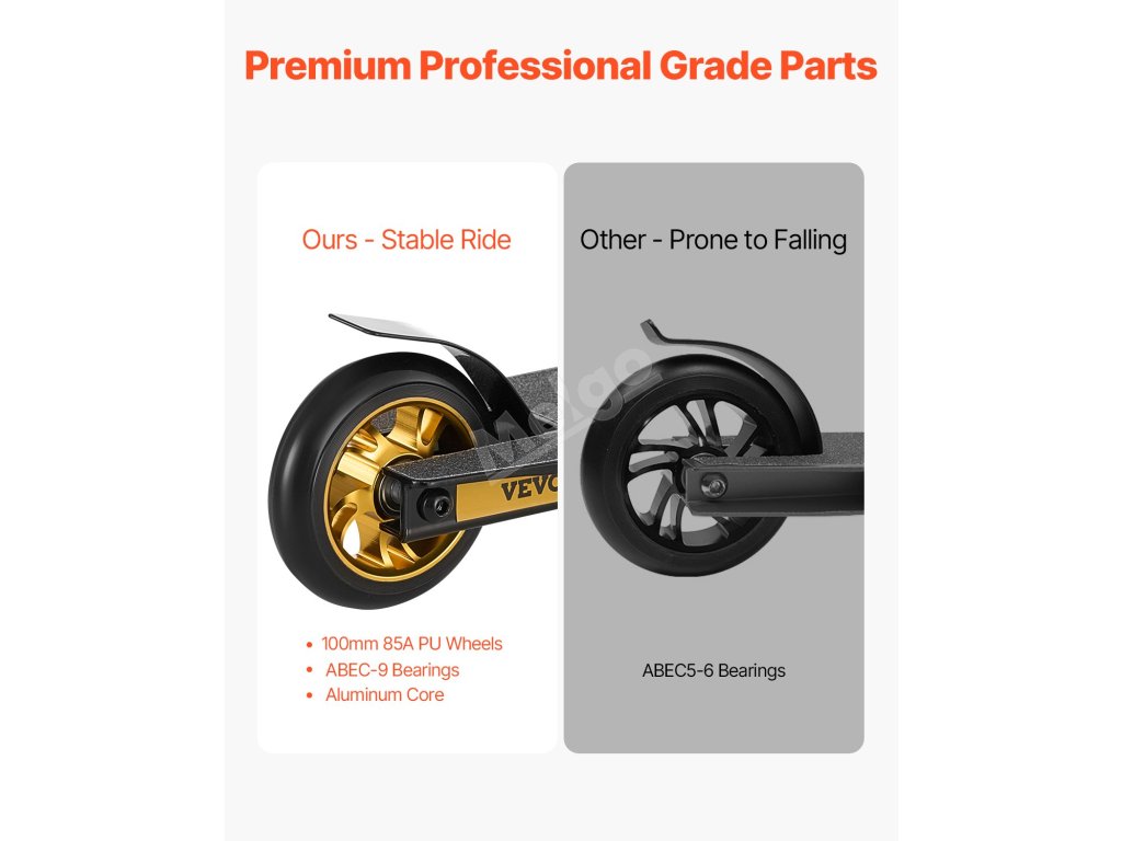 Stredne pokročilá kaskadérska kolobežka pre začiatočníkov je vybavená zosilnenou vidlicou zo zliatiny ocele so závitom, osadenou tichými 100 mm PU kolieskami, ktoré zabezpečujú plynulú jazdu. Vďaka modernizovaným vysokorýchlostným guličkovým ložiskám ABEC-9 je vhodná na rýchlu jazdu.