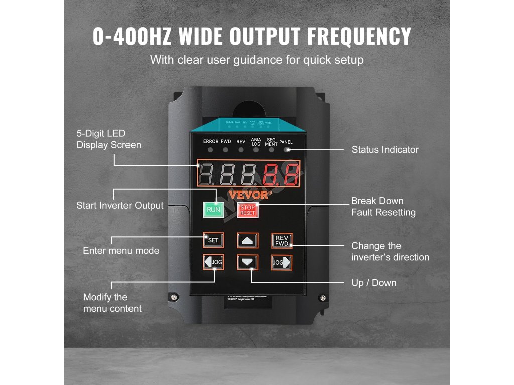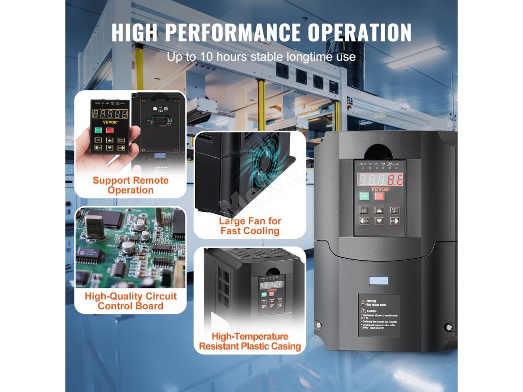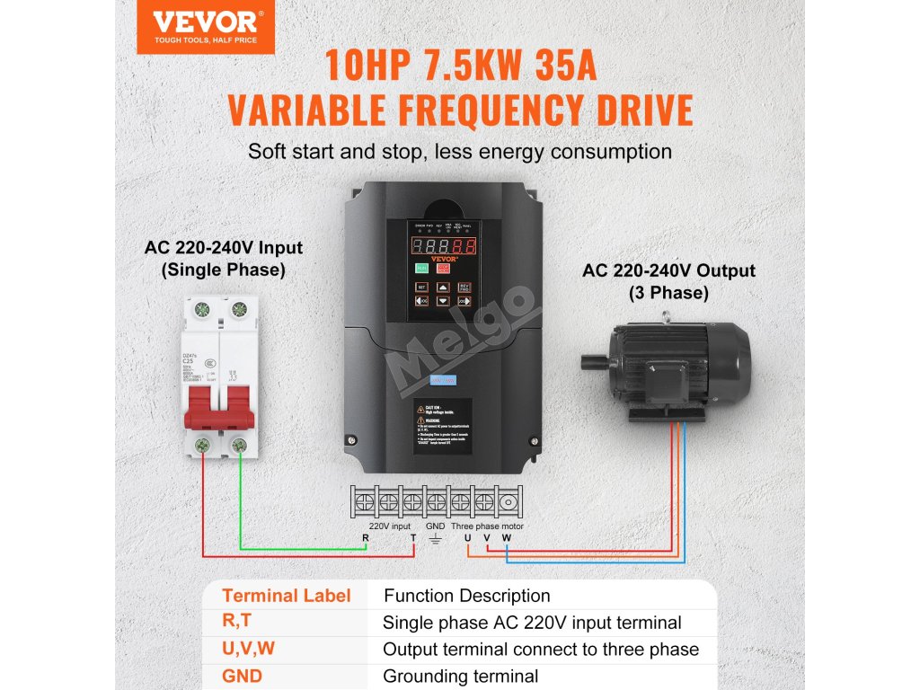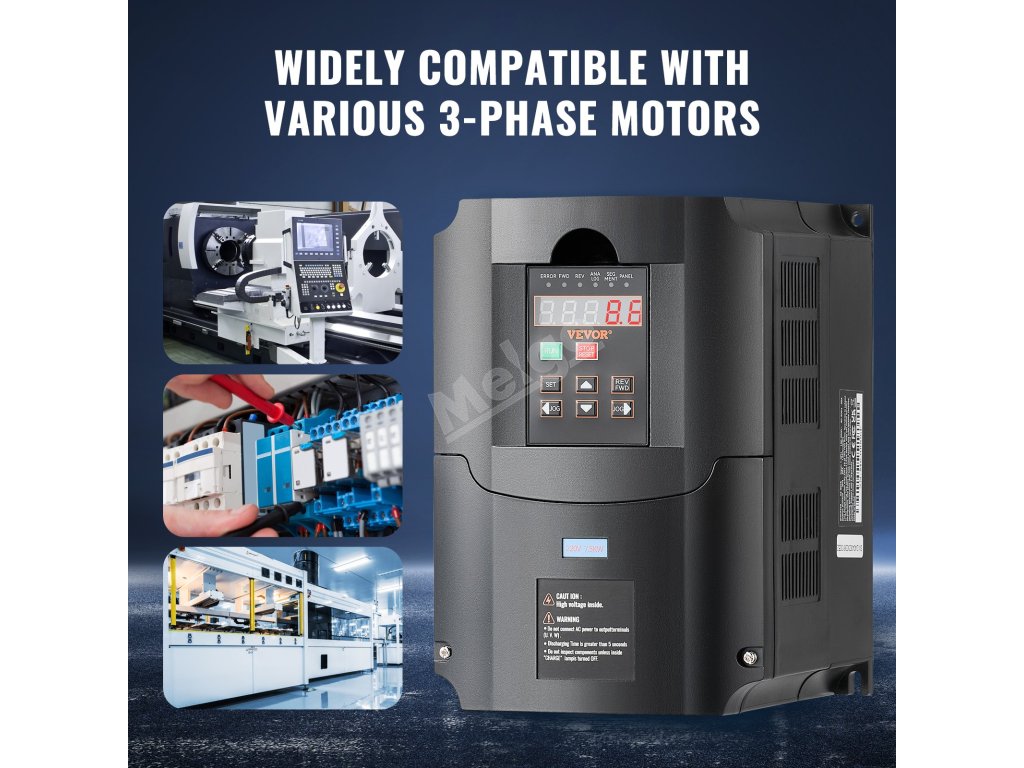 Vstup měniče frekvence je jednofázový 220 V (1PH) nebo třífázový 220 V (3PH) a výstup je třífázový 220 V (3PH). Díky jednoduchému zapojení, intuitivnímu displeji a komplexním ochranám zjednodušuje obsluhu, zvyšuje energetickou účinnost a minimalizuje poruchy stroje.