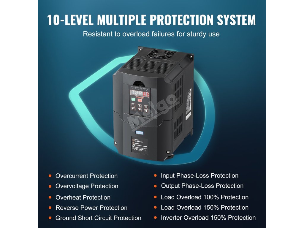 Naše VFD jsou vybaveny inteligentním ochranným systémem, který zajišťuje bezpečnost proti nadproudu, přetížení, přepětí a ztrátě fáze. Je vyroben převážně z nehořlavého ABS, což zajišťuje vysoký výkon a kvalitu uvnitř a poskytuje vám klid při používání.