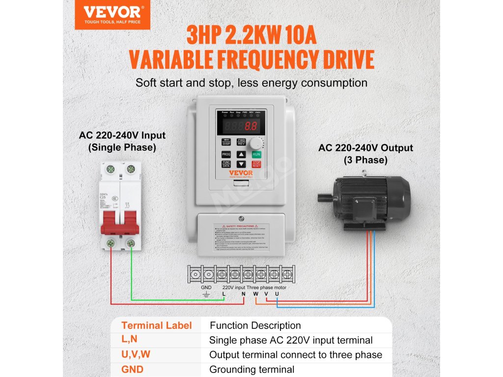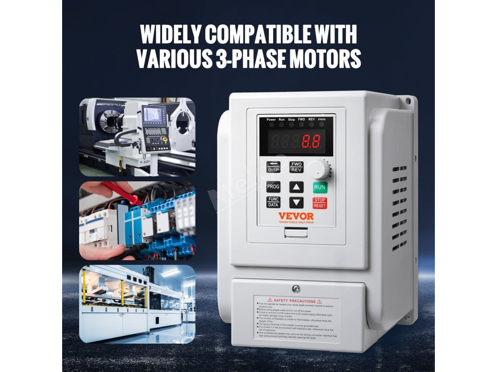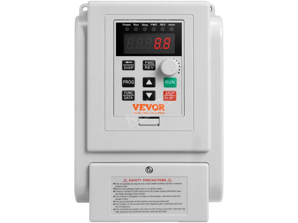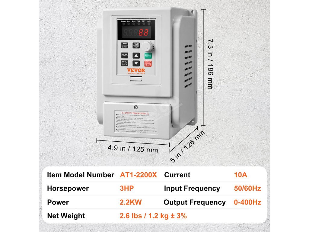 VFD VEVOR 2,2 kW, 10 A, 3 HP zajišťuje přesné řízení otáček motoru prostřednictvím přesné frekvence a amplitudy hnacího proudu motoru. Díky jednoduchému zapojení, uživatelsky přívětivému panelu a plynulému spouštění/zastavování zjednodušuje obsluhu, zvyšuje energetickou účinnost a minimalizuje poruchy stroje.