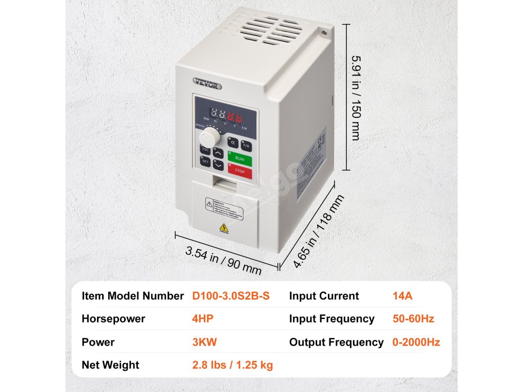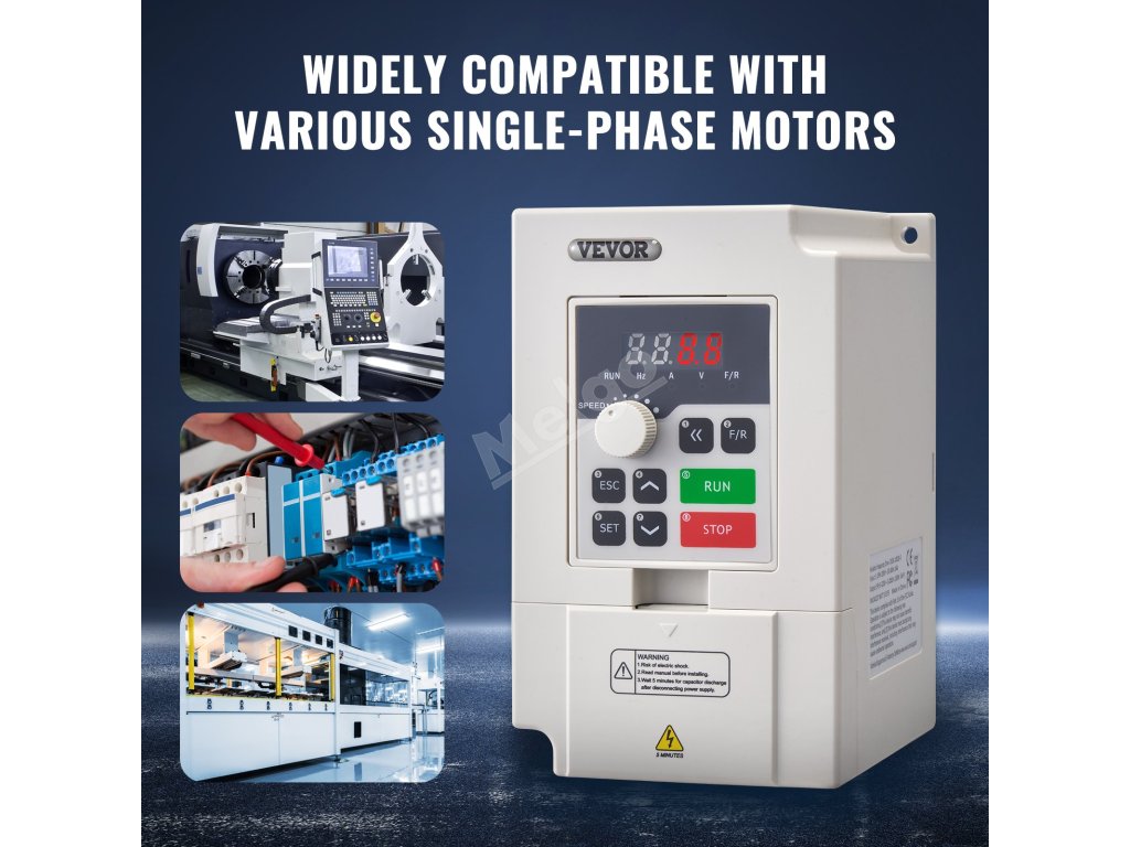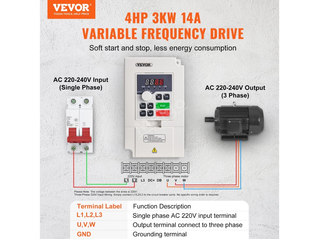 Vstupem VFD je jednofázový střídavý proud 220 V (1PH) nebo třífázový střídavý proud 220 V (3PH) a výstupem je třífázový střídavý proud 0~220 V (3PH). Díky jednoduchému zapojení, intuitivnímu displeji a komplexním ochranám zjednodušuje obsluhu, zvyšuje energetickou účinnost a minimalizuje poruchy stroje.