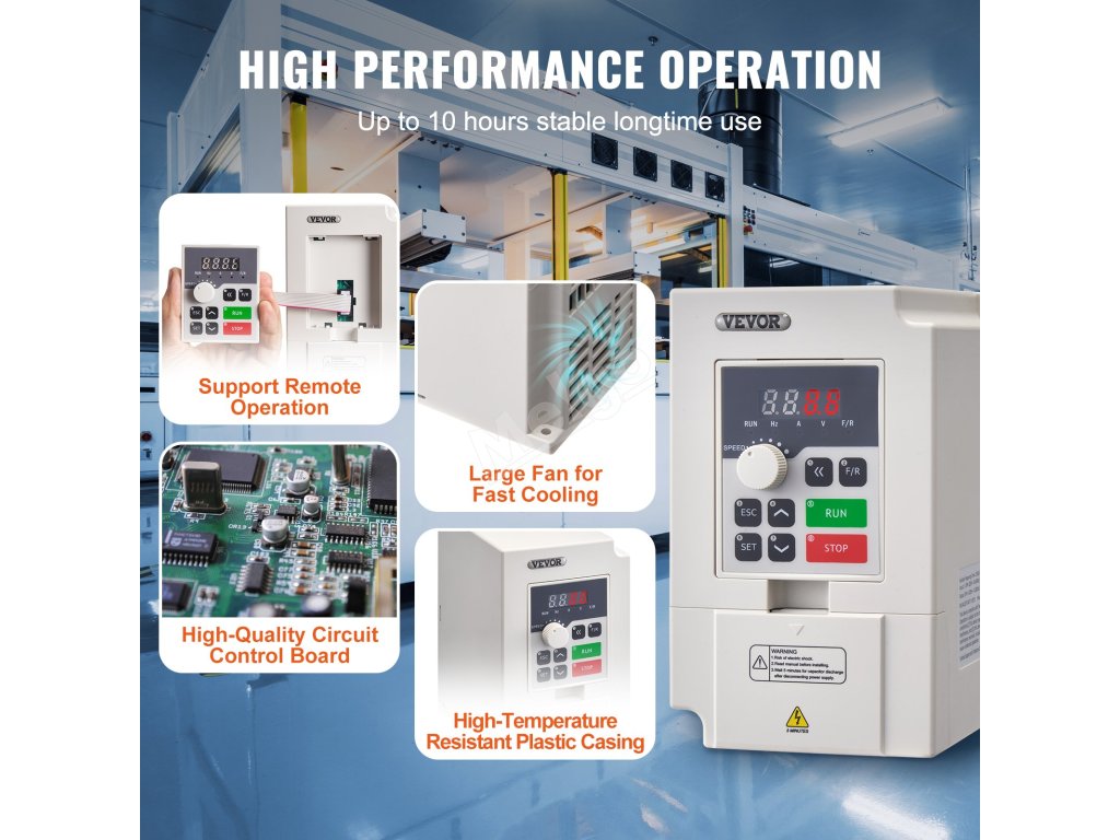 Naše VFD jsou vybaveny inteligentním ochranným systémem, který zajišťuje bezpečnost proti nadproudu, přetížení, přepětí a ztrátě fáze. Je vyroben převážně z nehořlavého plastu, který zaručuje vysoký výkon a kvalitu uvnitř.