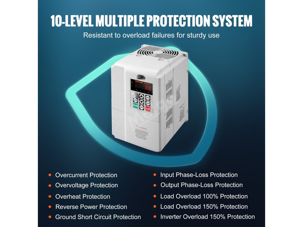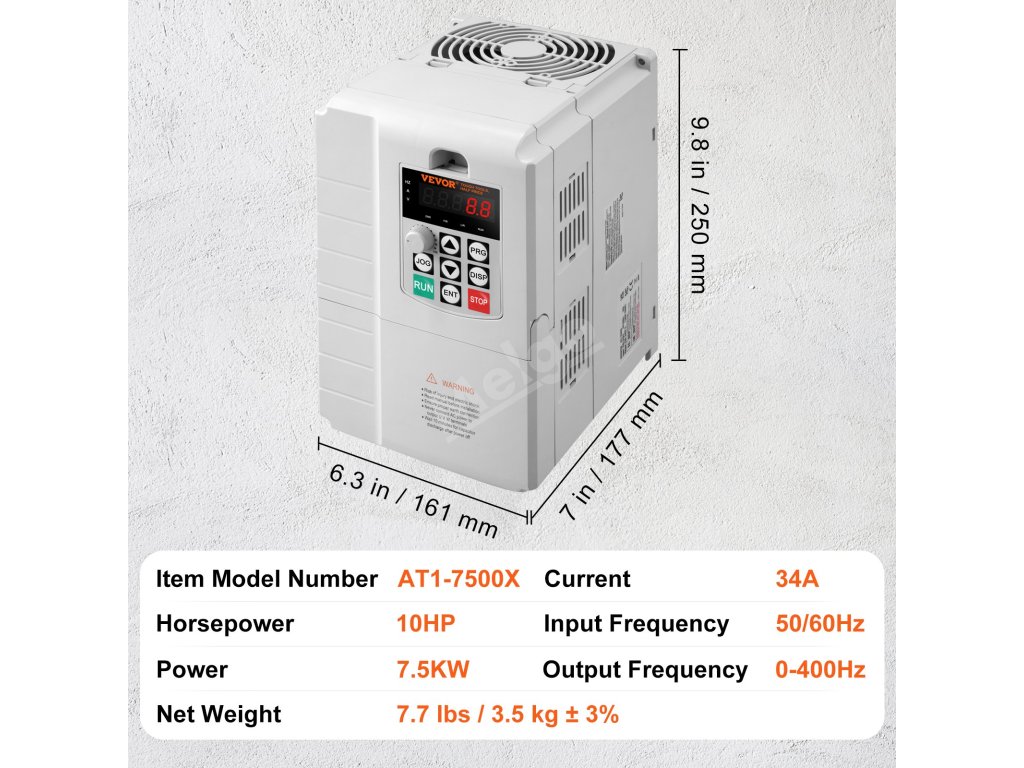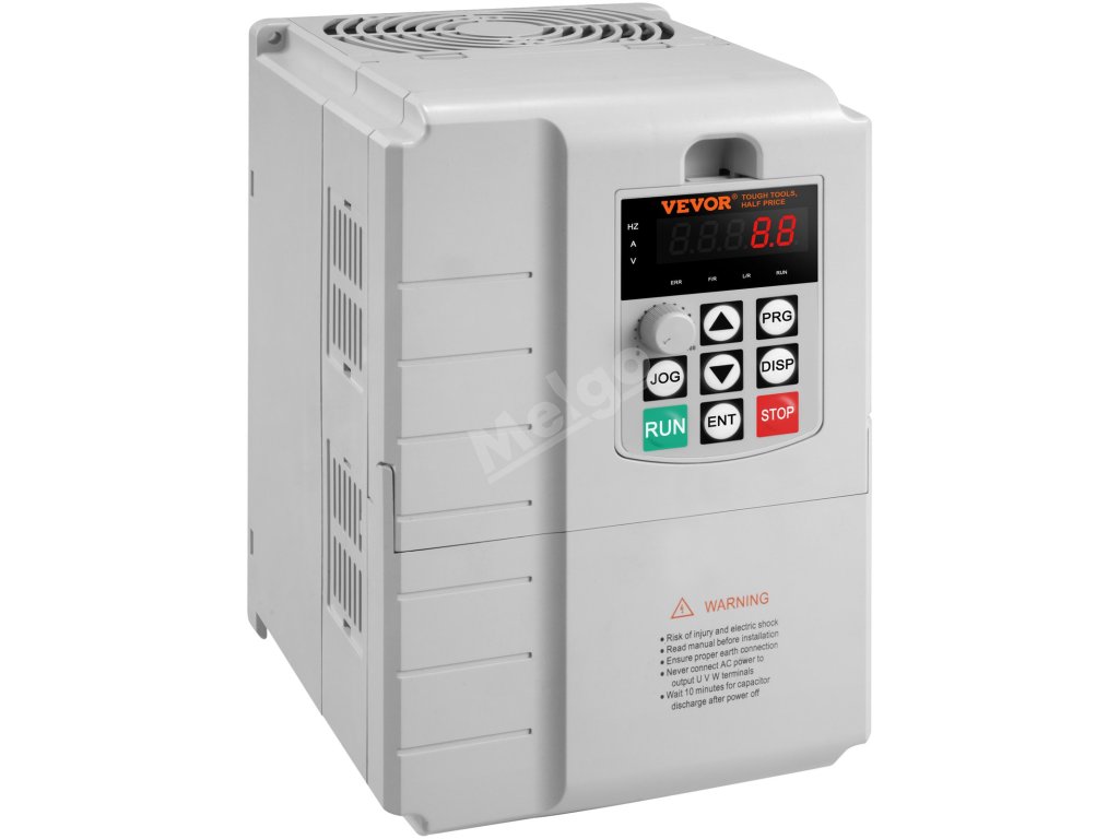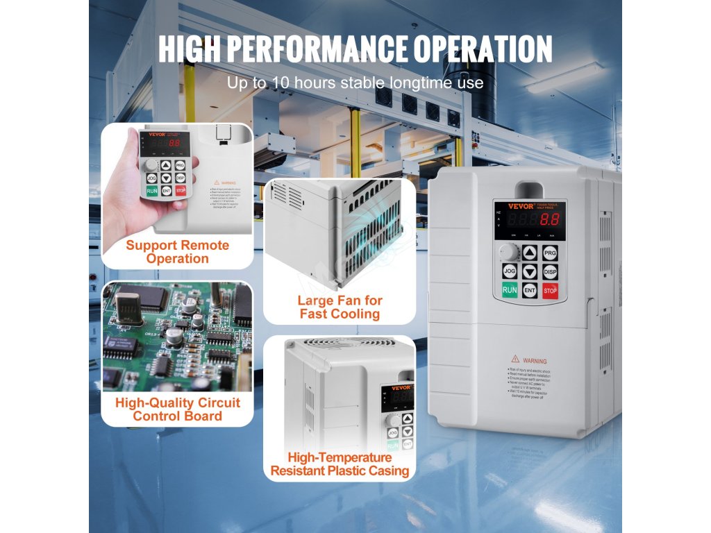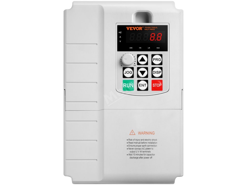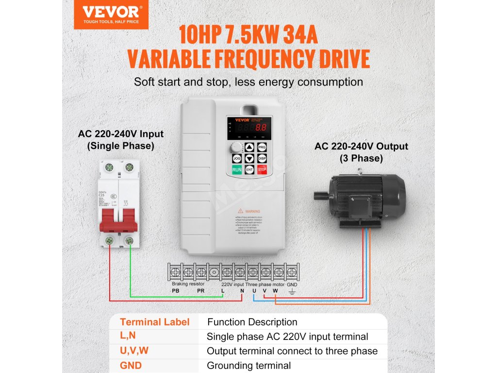 VFD VEVOR 7,5 kW, 34 A, 10 HP zajišťuje přesné řízení otáček motoru prostřednictvím přesné frekvence a amplitudy hnacího proudu motoru. Díky jednoduchému zapojení, uživatelsky přívětivému panelu a soft start/stop zjednodušuje obsluhu, zvyšuje energetickou účinnost a minimalizuje poruchy stroje.