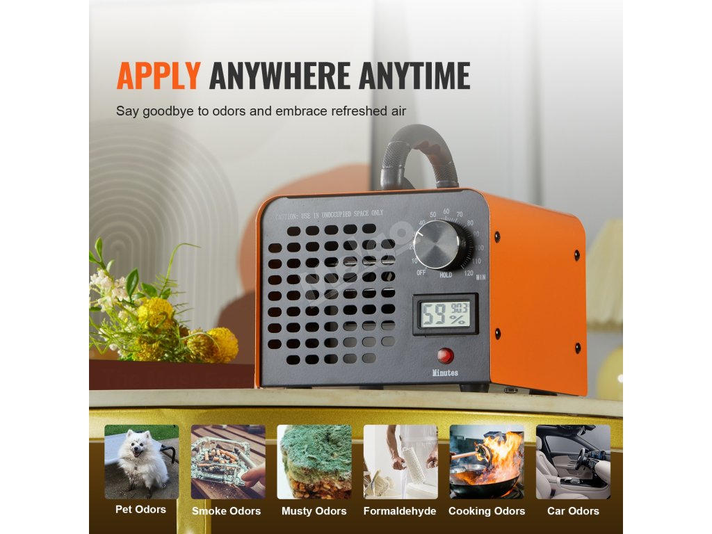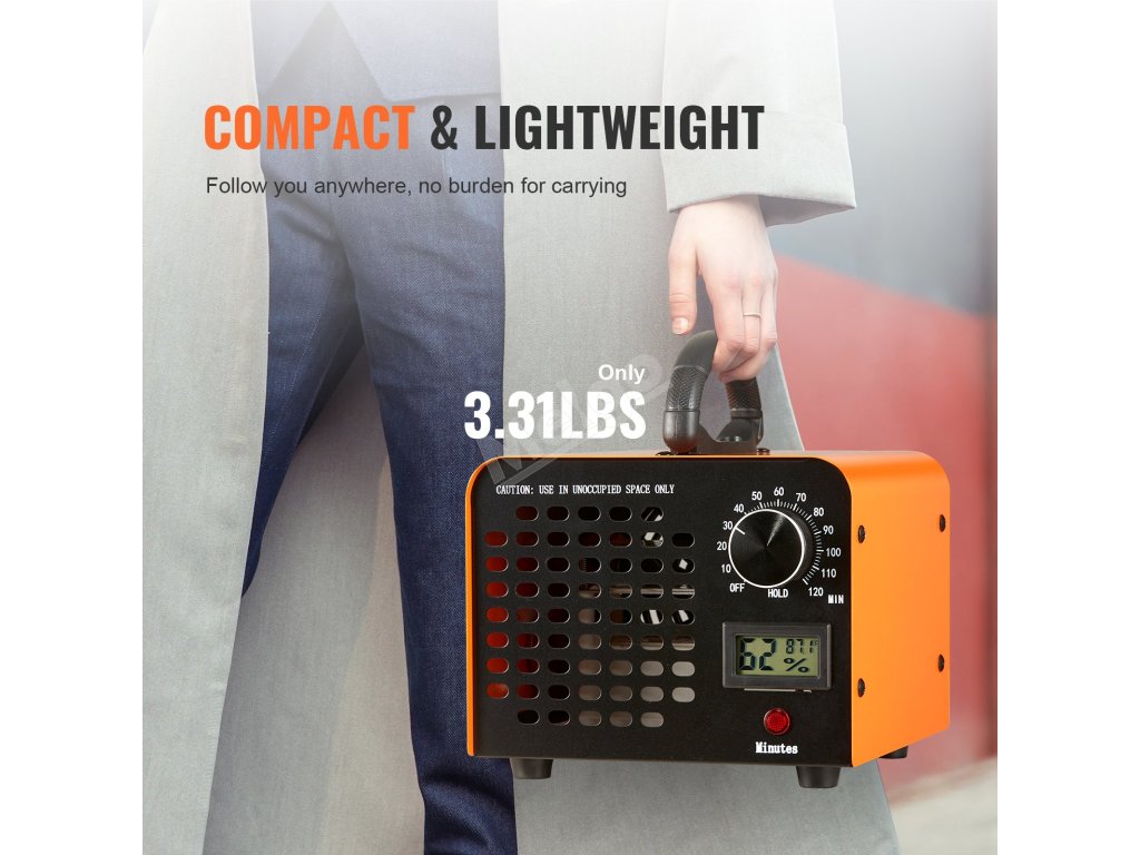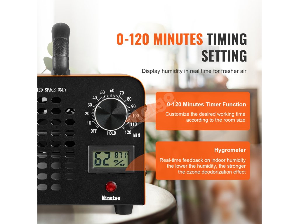 Tento komerční generátor ozonu, vybavený ukazatelem vlhkosti a časovačem na 0-120 minut, inteligentně monitoruje vnitřní prostředí a zajišťuje, aby pracoval co nejlépe. Můžete libovolně nastavit požadovanou dobu provozu až na 120 minut a využít režim "HOLD" pro udržení nepřetržitého provozu.