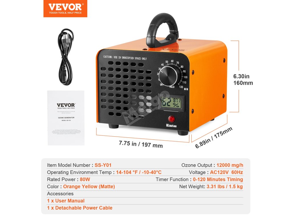 Díky výkonnému maximálnímu výstupu ozonu 12 000 mg/h a ploše pokrytí 3 230 čtverečních stop je prioritou ozonového generátoru VEVOR vaše zdraví, protože účinně odstraňuje zápach, kouř a znečišťující látky ze vzduchu. Je vybaven ukazatelem vlhkosti a časovačem na 0-120 minut, což zajišťuje neustálou kontrolu vašeho vnitřního prostředí.