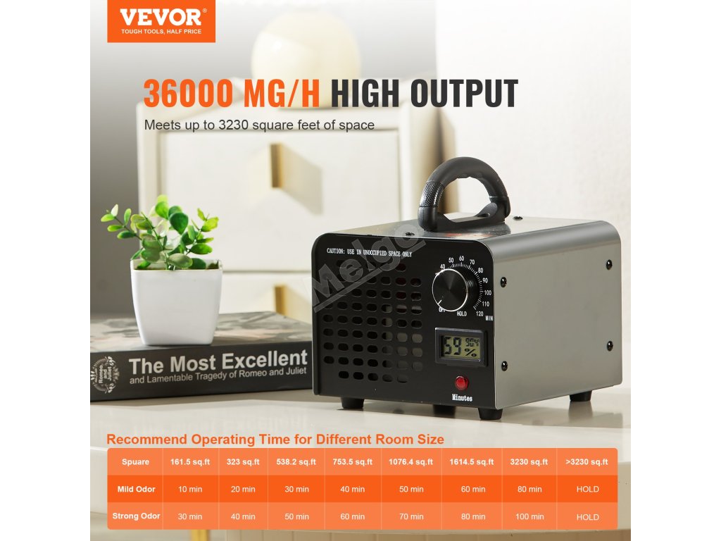 Díky výkonnému maximálnímu výstupu ozonu 36 000 mg/h a ploše pokrytí 3 230 čtverečních stop je prioritou ozonového generátoru VEVOR vaše zdraví, protože účinně odstraňuje zápach, kouř a znečišťující látky ze vzduchu. Je vybaven ukazatelem vlhkosti a časovačem na 0-120 minut, což zajišťuje neustálou kontrolu vašeho vnitřního prostředí.