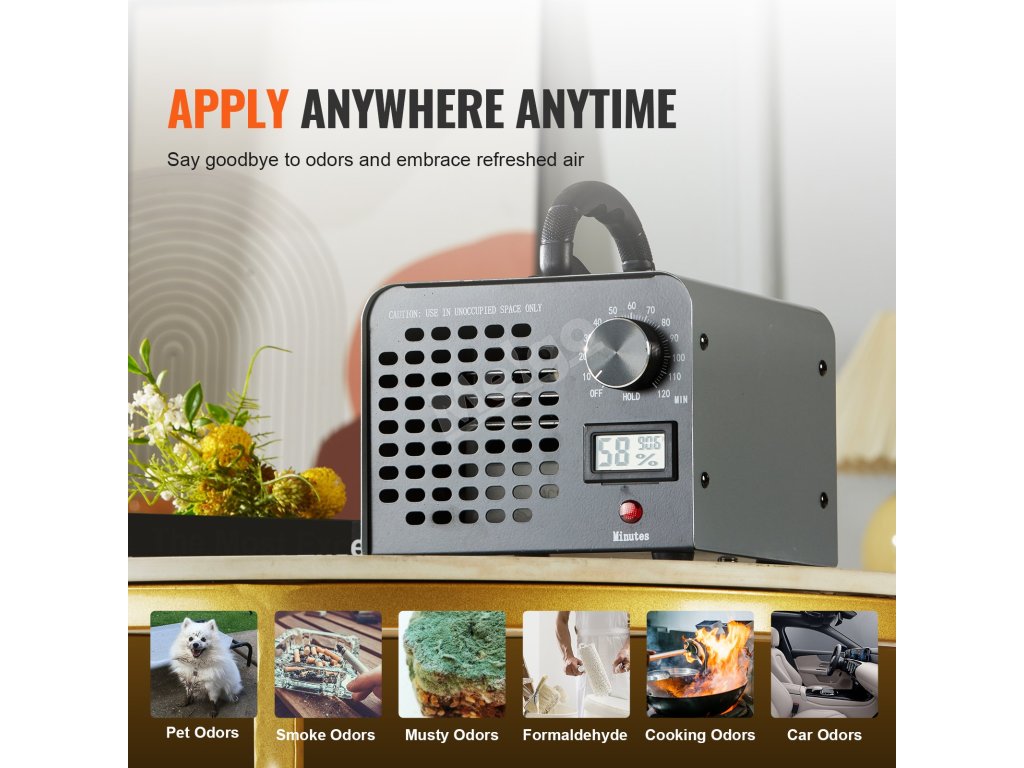 Tento komerční generátor ozonu, vybavený ukazatelem vlhkosti a časovačem na 0-120 minut, inteligentně monitoruje vnitřní prostředí a zajišťuje, aby pracoval co nejlépe. Můžete libovolně nastavit požadovanou dobu provozu až na 120 minut a využít režim "HOLD" pro udržení nepřetržitého provozu.