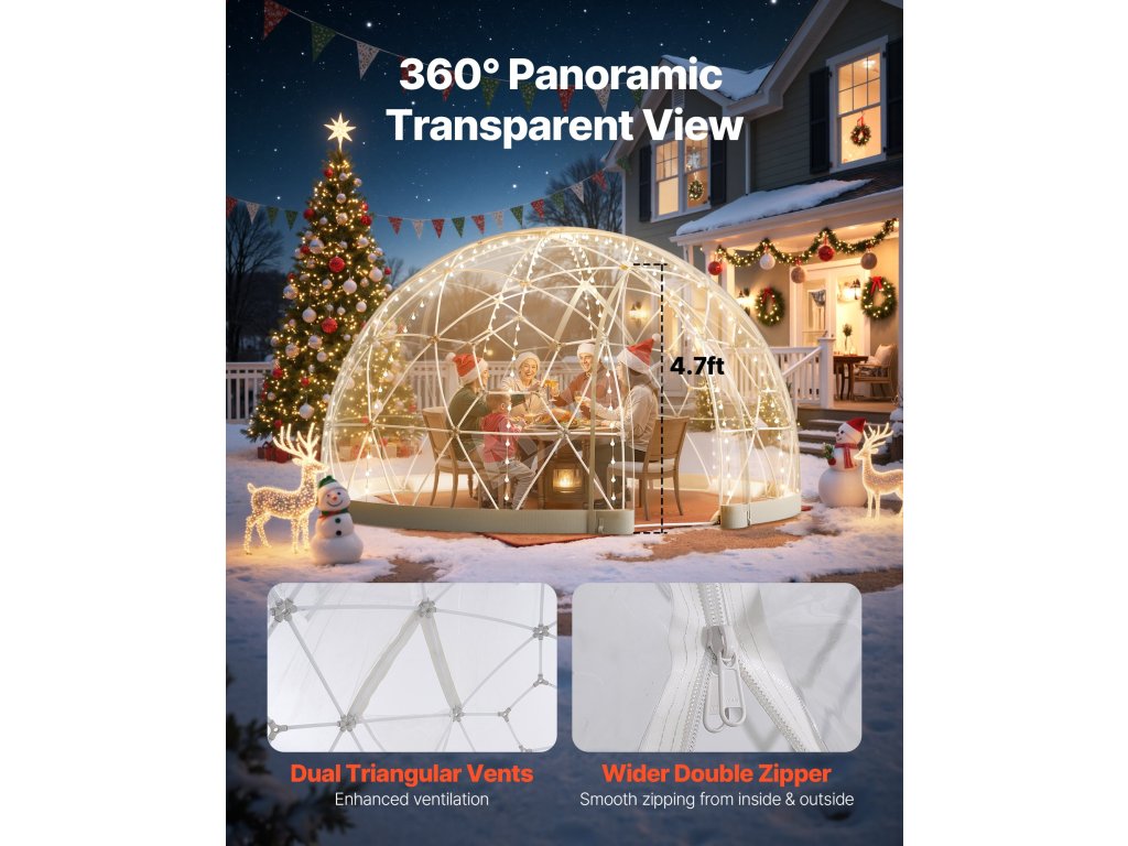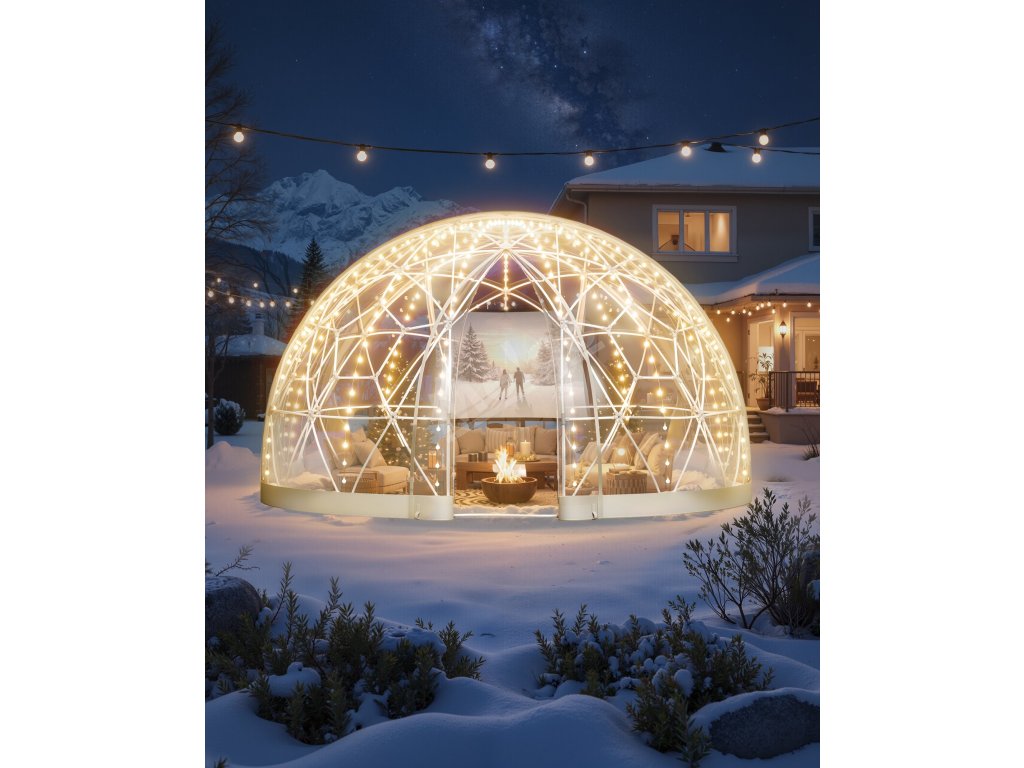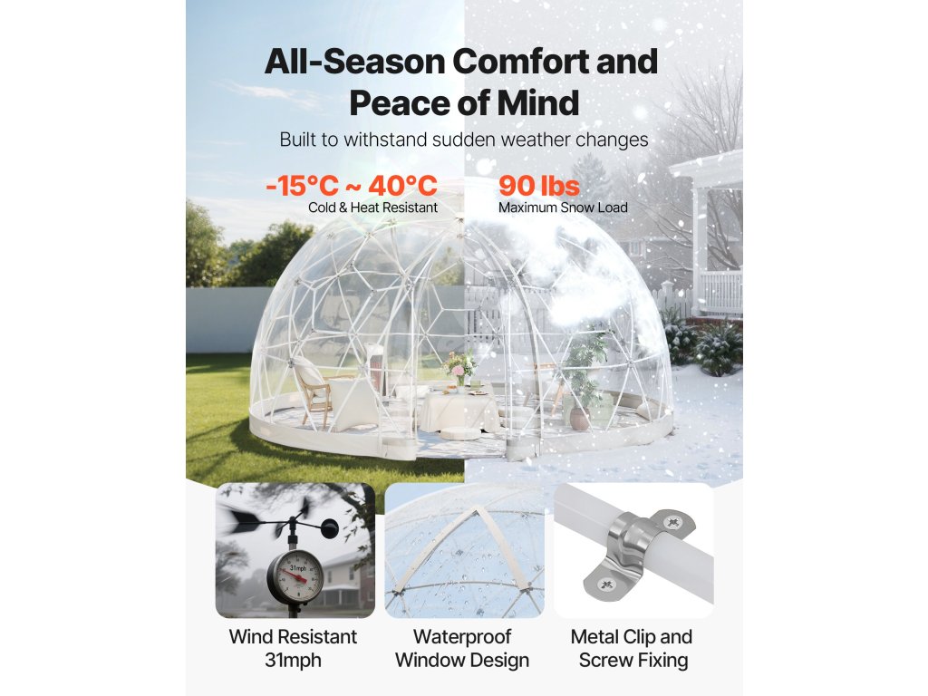A1: Tento kopulovitý stan je určen pro celoroční použití. Plášť z PVC odolného proti chladu o tloušťce 0,3 mm a větruvzdorný rám odolávají teplotám (od 5°F do 104°F) a poskytují vynikající izolaci a ochranu. Pro zimní použití doporučujeme umístit dovnitř ohřívač.