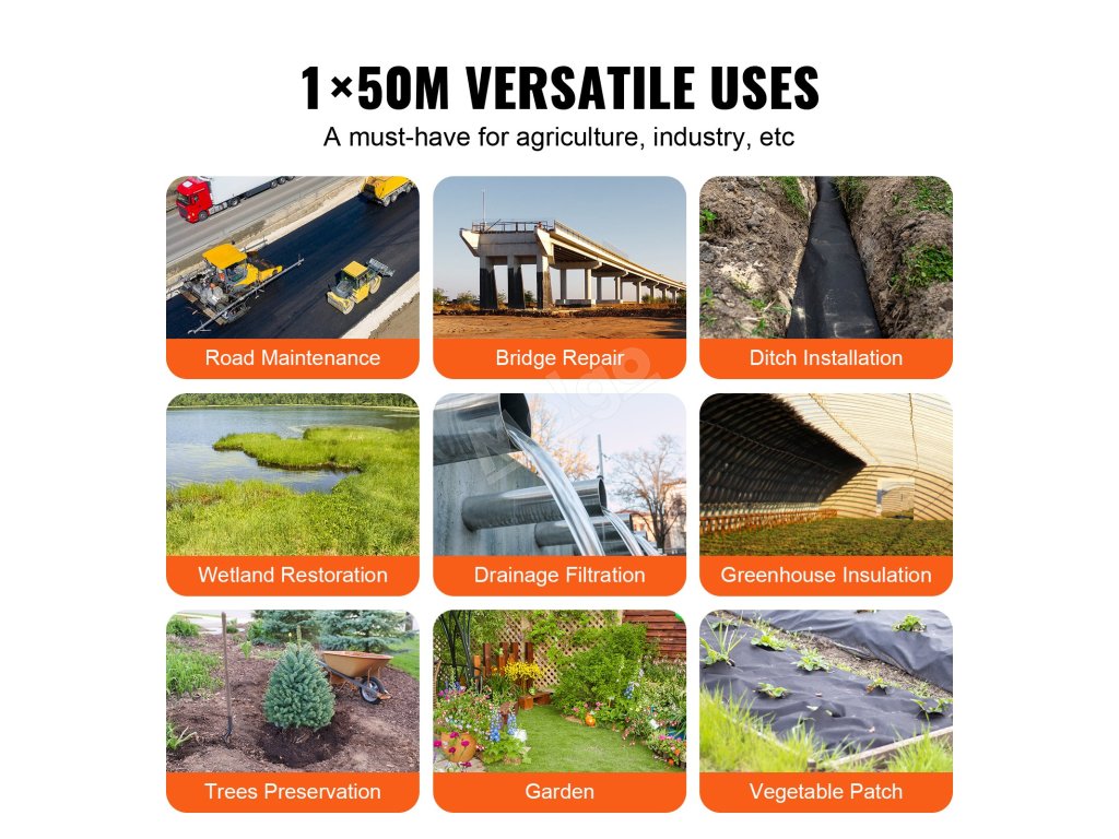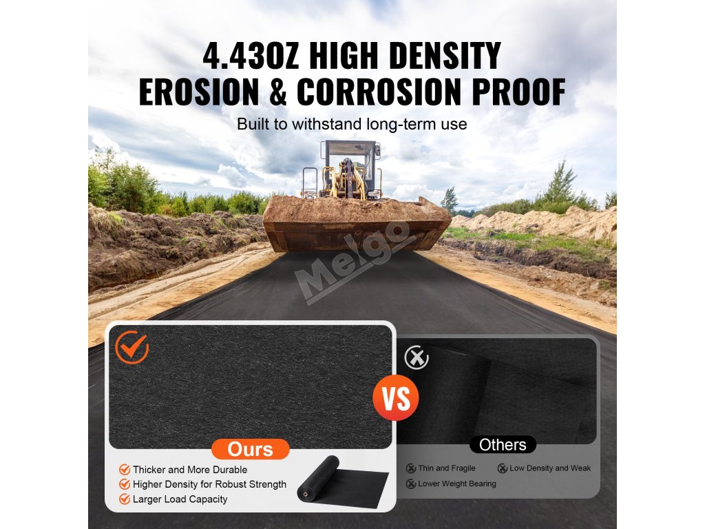 Rozlučte se s tvrdohlavým plevelem! Vysoce hustá krajinná tkanina VEVOR 3,28 × 164 stop, 4,43 OZ odolná proti plevelu se může pochlubit výjimečnou propustností a prodyšností a zároveň odolností proti roztržení, korozi a erozi. Zlepšuje zdraví půdy tím, že reguluje růst plevele, a spolehlivě chrání zahradu.
