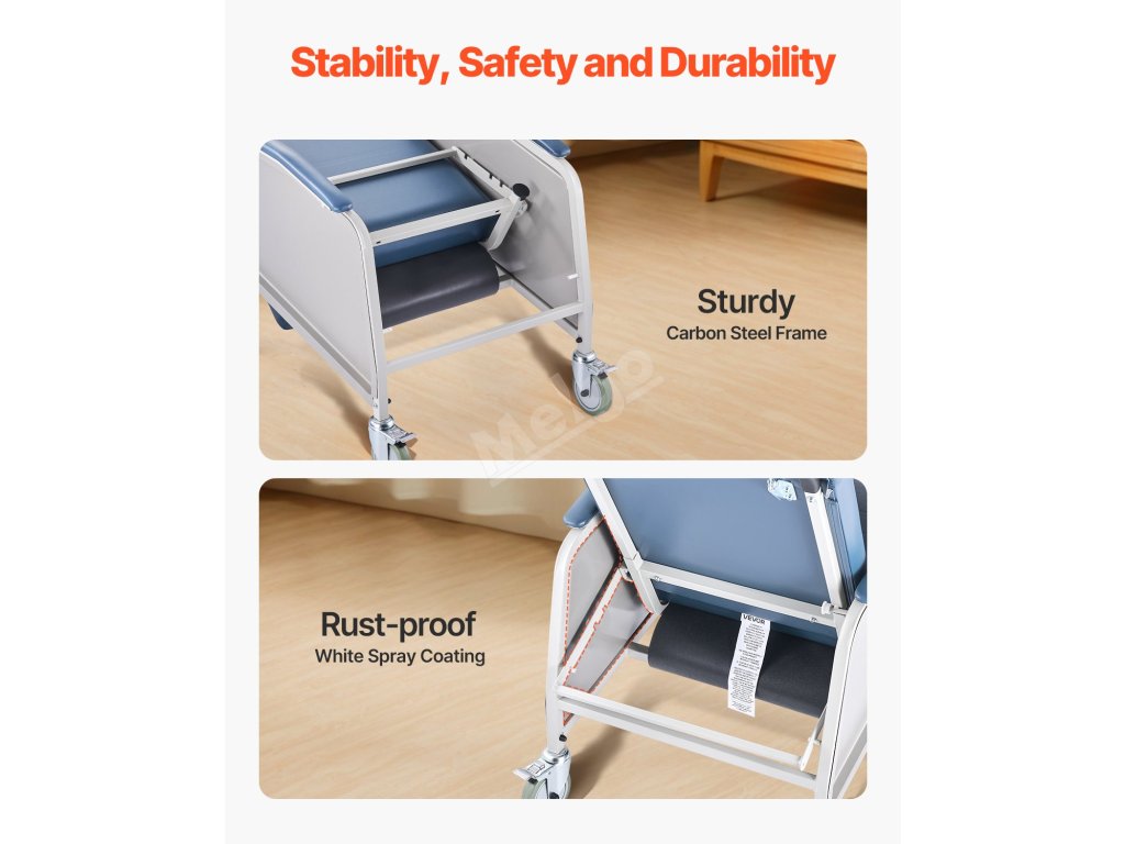 Toto nemocniční polohovací křeslo je vyrobeno z vysoce pevného rámu z uhlíkové oceli a je opatřeno bílou práškovou barvou, je odolné a nerezaví. S nosností 113 kg/250 liber poskytuje spolehlivou stabilitu a oporu uživatelům různých typů postavy