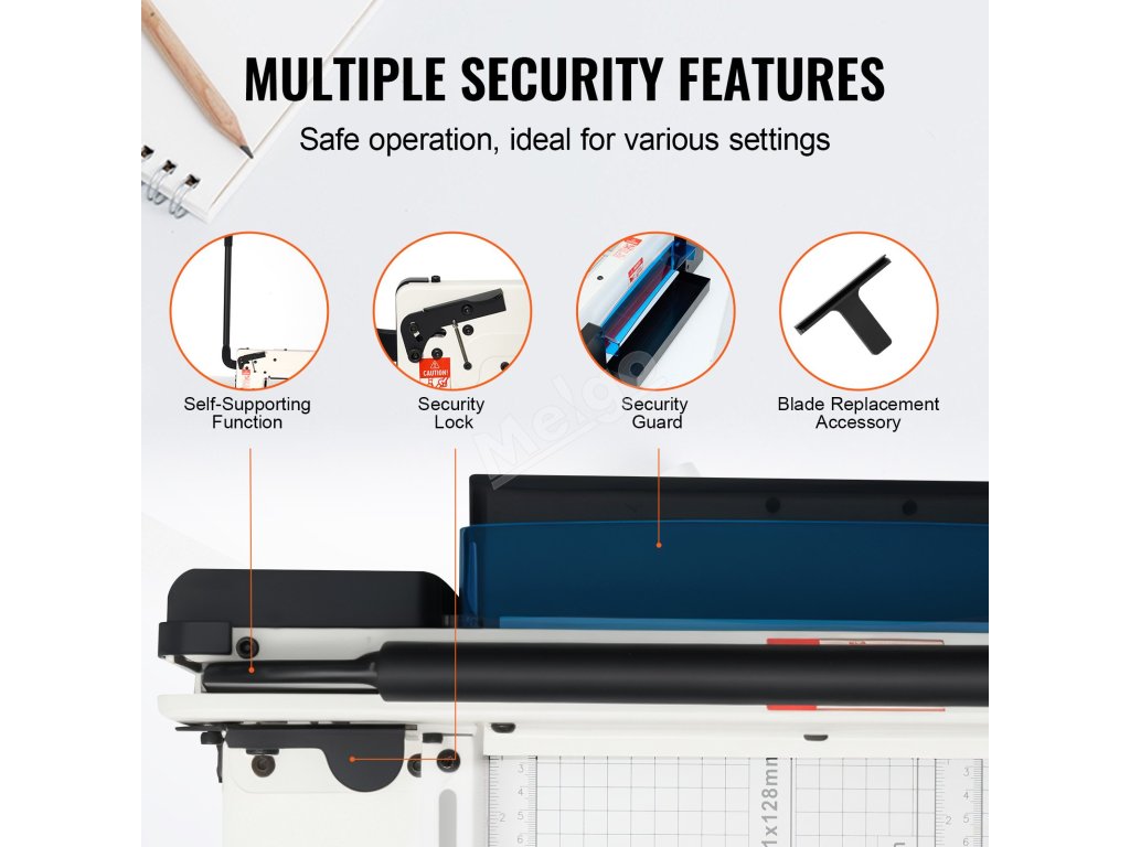 Samonosná konstrukce nože naší gilotiny na řezání papíru zaručuje bezpečné a stabilní řezání. Díky bezpečnostnímu krytu a zámku čepele nedojde k náhodnému dotyku!