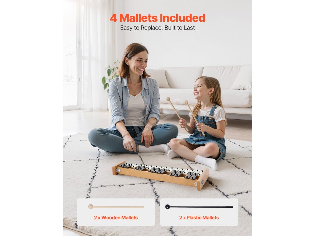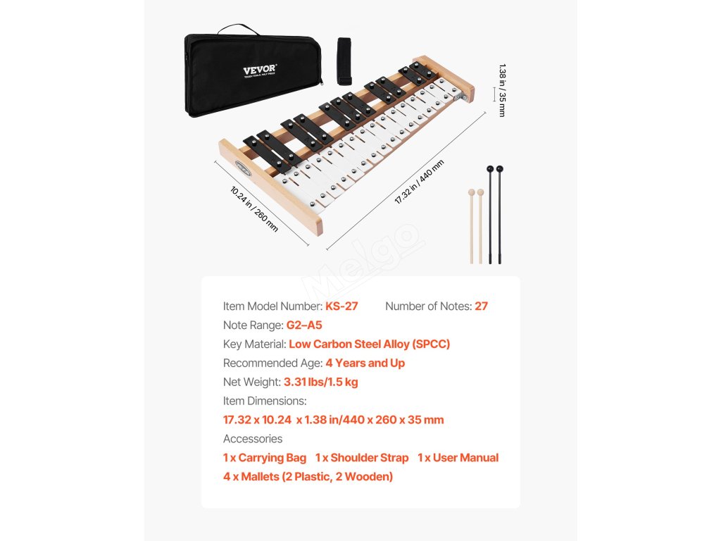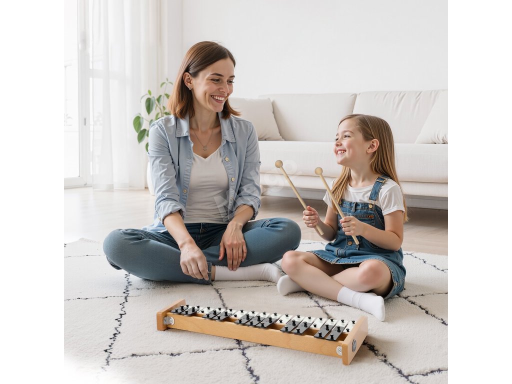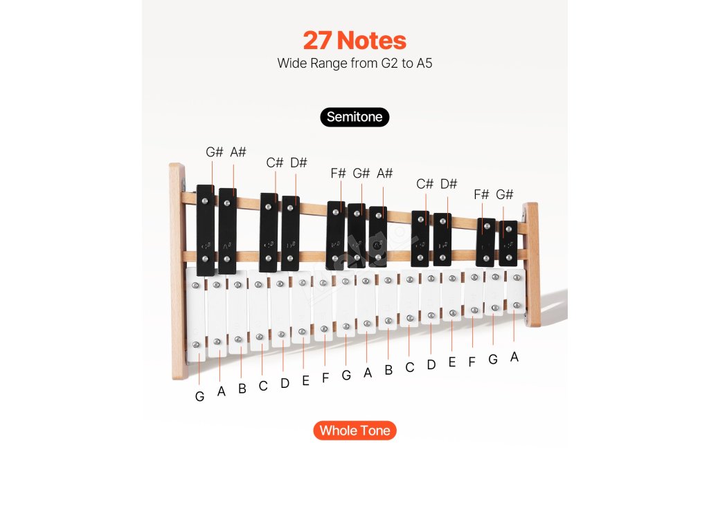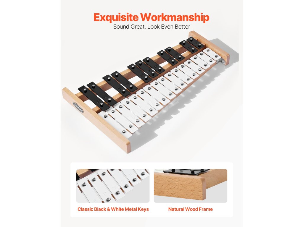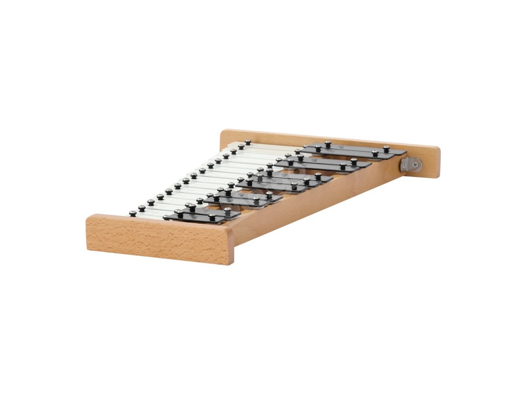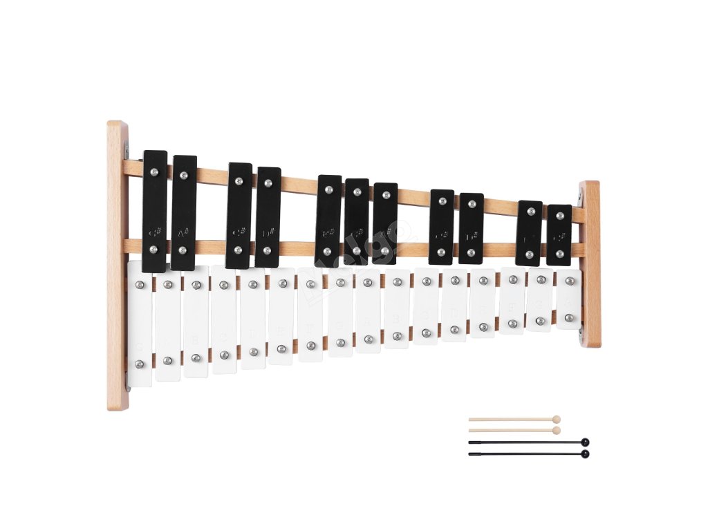 Tento zvonkový nástroj s podstavcem z přírodního dřeva a černými a bílými kovovými klávesami je vizuálně přitažlivý a zvukově příjemný pro milovníky hudby všech věkových kategorií. Je vhodný pro ranou hudební výchovu, školní kapely nebo i profesionální vystoupení.
