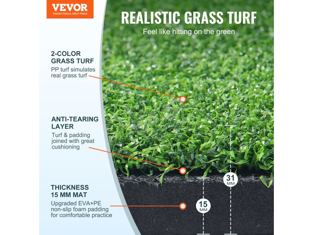 Vyzkoušejte si pocit z úderu do greenu s naší dvoubarevnou travní podložkou. Golfová podložka s antiadhézním povlakem má tloušťku 15 mm a nabízí odolný a realistický tréninkový povrch, který věrně kopíruje podmínky na skutečném golfovém hřišti.