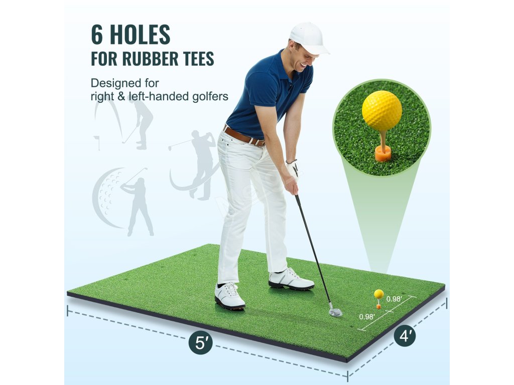 Tato venkovní golfová podložka je všestranná, vhodná pro praváky i leváky, se šesti otvory pro gumová odpaliště. Můžete ji používat v různých směrech, abyste zabránili měkkému zborcení při příliš dlouhém stání na jednom místě.
