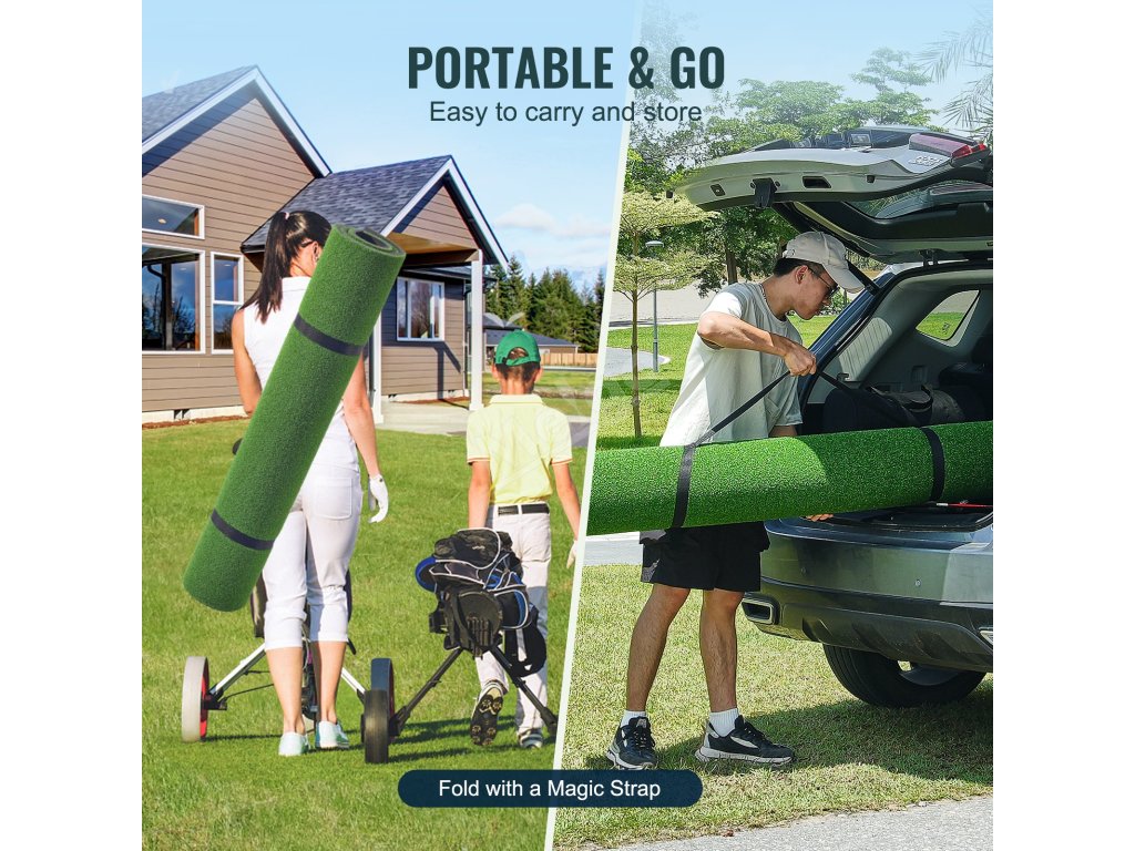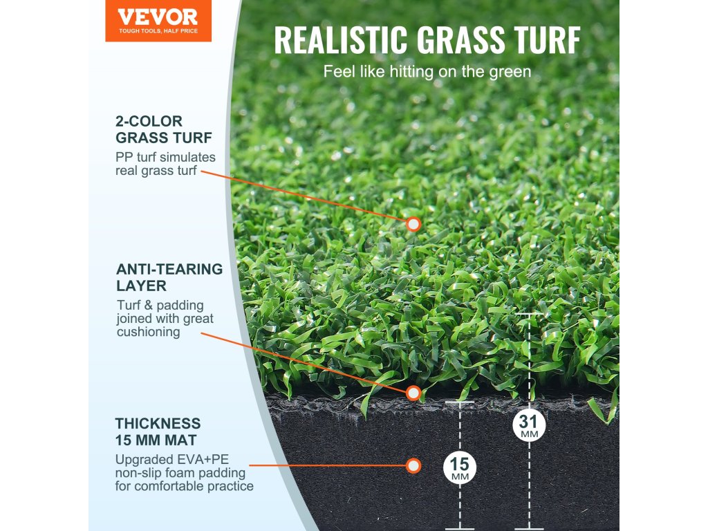 Vyzkoušejte si pocit z úderu do greenu s naší dvoubarevnou travní podložkou. Golfová podložka s antiadhézním povlakem má tloušťku 15 mm a nabízí odolný a realistický tréninkový povrch, který věrně kopíruje podmínky na skutečném golfovém hřišti.