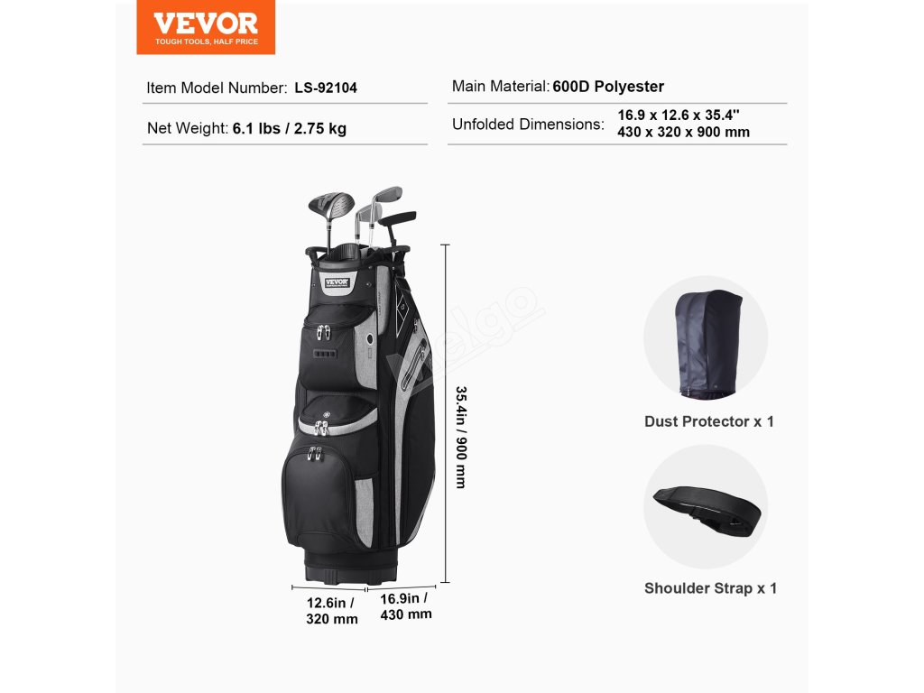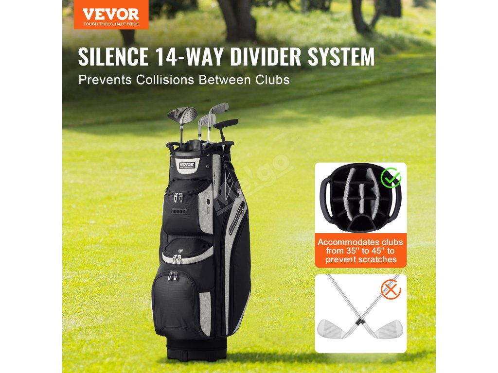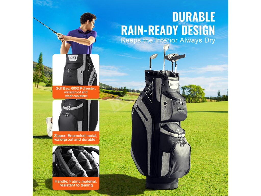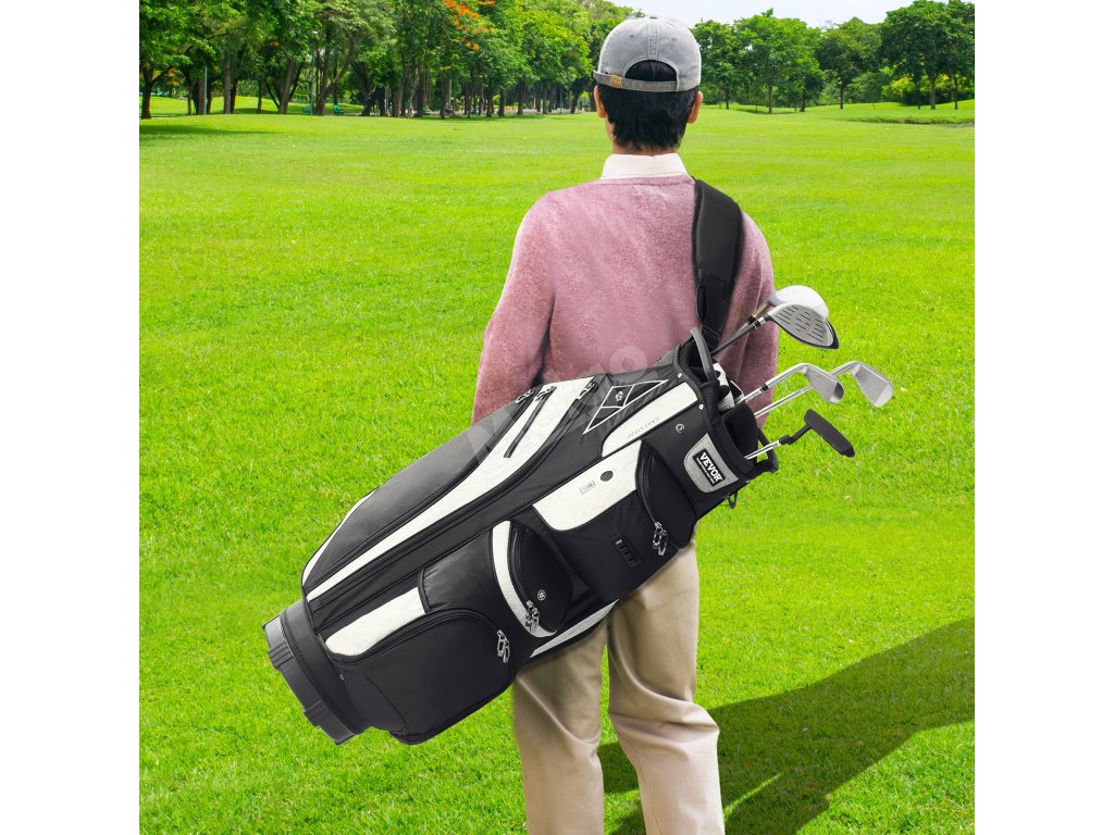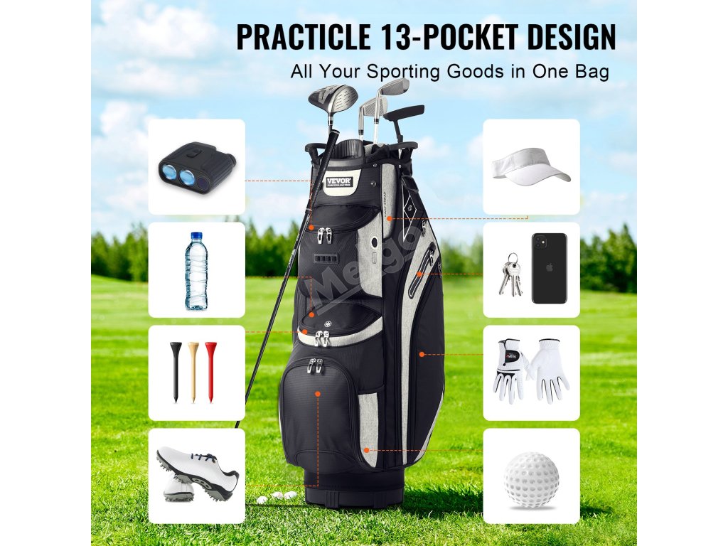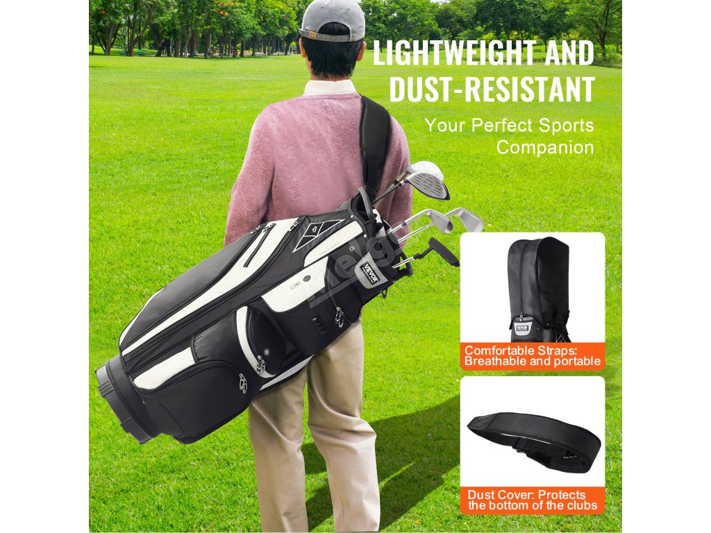 Vyztužený golfový vak, vodotěsný a odolný. Náš golfový bag se 14cestným dělícím systémem a mnoha kapsami vám umožní uložit hole do oddělených přihrádek a uspořádat si různé sportovní vybavení. Díky tomu bude váš golfový trénink pohodlnější a bez starostí!