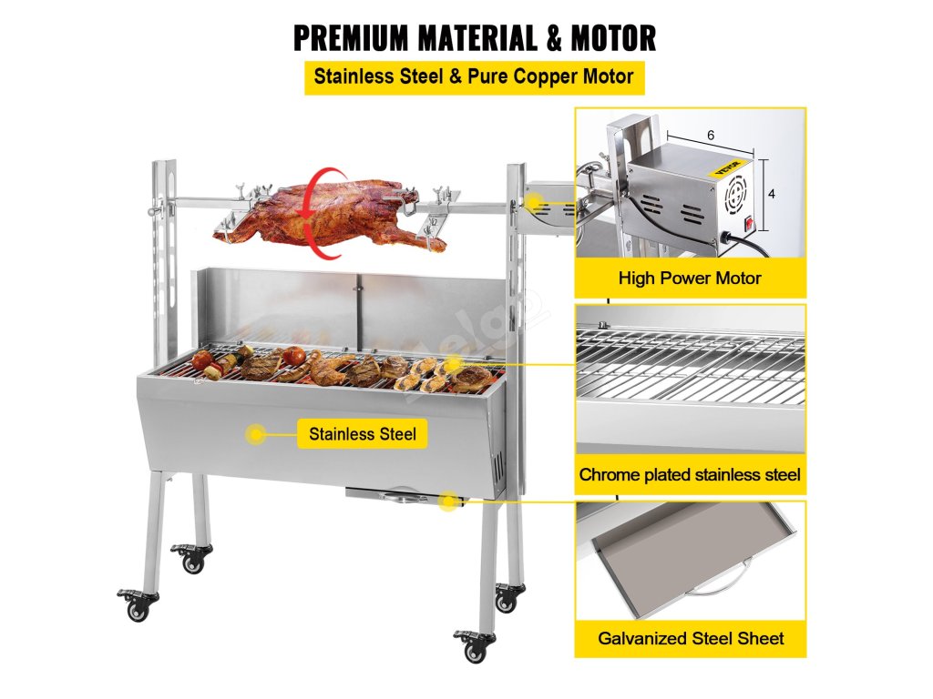 Tento grilovací rožeň na jehněčí je ideální pro pracovní a rodinné použití i pro společenské grilovací večírky. Maximální hmotnost rožně je až 132 kg, aby vyhovoval vašim potřebám při grilování. Rám z nerezové oceli a výkonný motor zvyšují stabilitu a účinnost. Různá intimní provedení zvyšují váš uživatelský komfort. Přijďte si vychutnat chutné jídlo a spokojenou večeři s naší troubou na jehněčí.