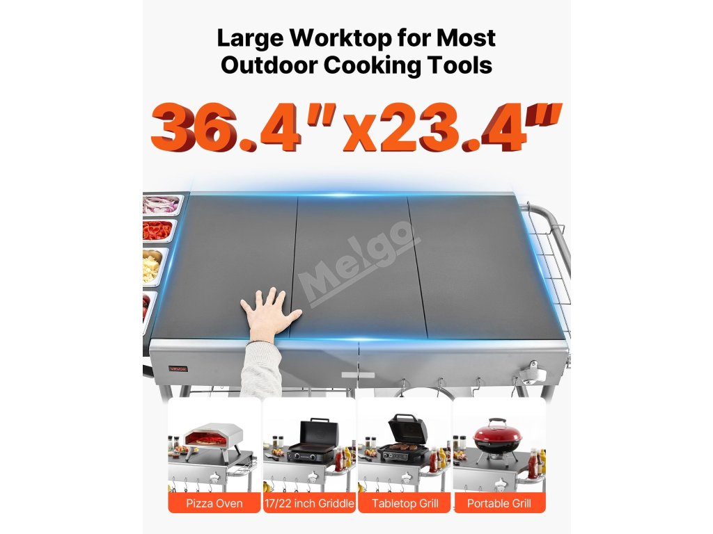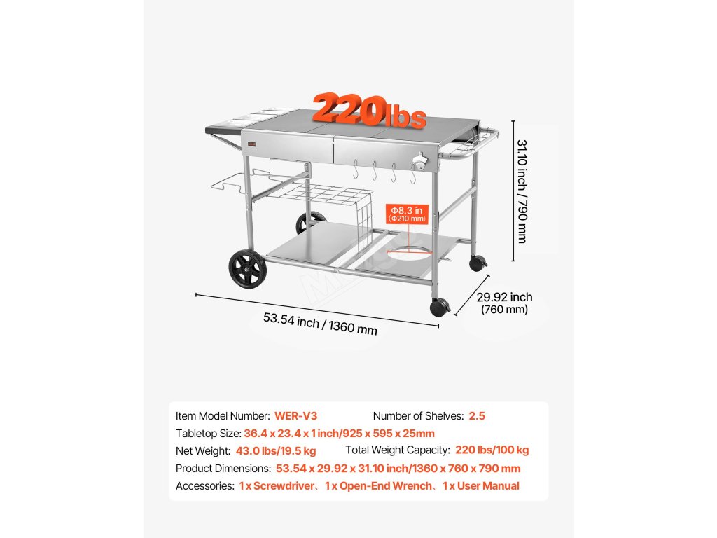Tento venkovní grilovací vozík s deskou o rozměrech 925 x 595 mm a 2,5úrovňovým úložným systémem poskytuje dostatek prostoru pro přípravu pokrmů a organizaci. Jeho součástí je držák na papírové utěrky, otvírák na lahve a háčky, které usnadňují práci. Konstrukce z uhlíkové a nerezové oceli 201 unese 220 lbs/100 kg, takže je ideální pro terasy a grily.