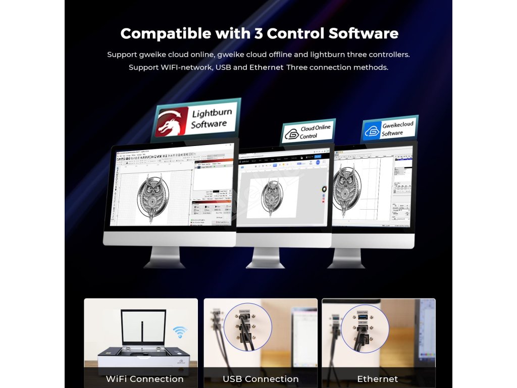 Zařízení je kompatibilní ssoftware LightBurn a RDWorksumožňuje snadnou správu projektů a širokou podporu grafických formátů. Jehorobustní konstrukce zajišťuje dlouhou životnost a spolehlivý výkon v nepřetržitém provozu.