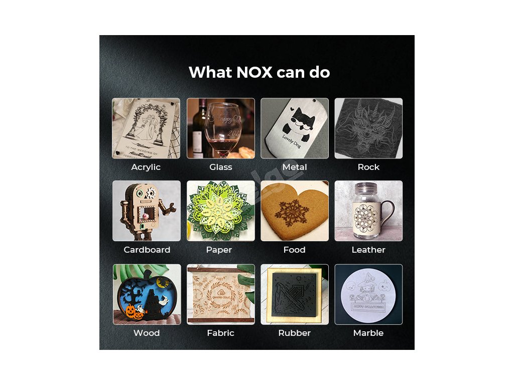 Zařízení podporujevíce možností připojení (USB, Ethernet) a je kompatibilní sLightBurn a RDWorks. NOX pracuje s různými formáty souborů, včetněSVG, DXF, JPG, PNG, BMP a další, který poskytuje širokou škálu možností pro navrhování a zpracování grafiky.