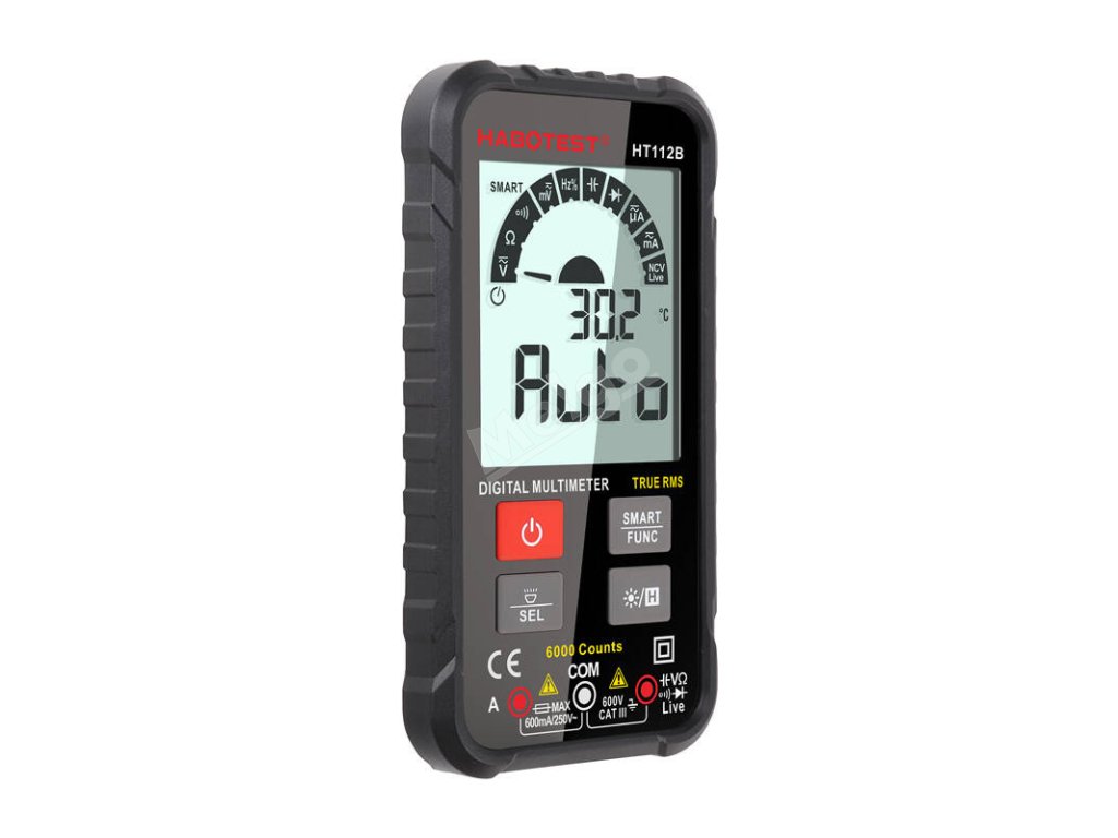 HT112B je ultratenký inteligentní multimetr nové generace. Je vybaven velkým 2,88″ displejem a silikonovými tlačítky - snadno a pohodlně se používá. Poskytuje přesné měření různých parametrů. Je kompaktní a lehký - má také LED svítilnu, která umožňuje pracovat i na tmavých místech. K napájení jsou zapotřebí 2 baterie CR2302 3V.