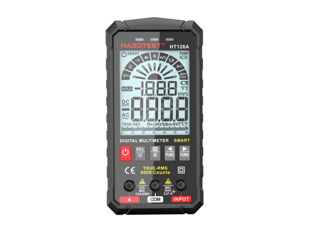 HT126A je chytrý a odolný multimetr od společnosti Habotest. Vyznačuje se přesným měřením a můžete jej používat i venku. Je vybaven velkým displejem a silikonovými tlačítky - snadno a pohodlně se používá. Je kompaktní a lehký - má také LED svítilnu, která vám umožní pracovat i na tmavých místech. K napájení jsou potřeba 4 baterie AAA 1,5 V. Ty však nejsou součástí balení a je třeba je zakoupit zvlášť. Můžete jej použít k měření napětí, odporu, kapacity atd.