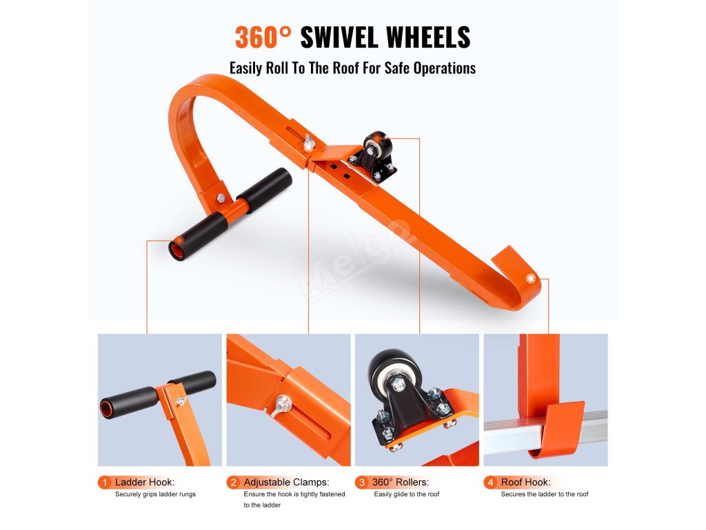 Náš hák na žebřík s otočnými kladkami o 360° usnadňuje po instalaci hladký pohyb do ideální polohy a zajišťuje rychlé a bezpečné nastavení pro bezpečné a pohodlné výškové práce.
