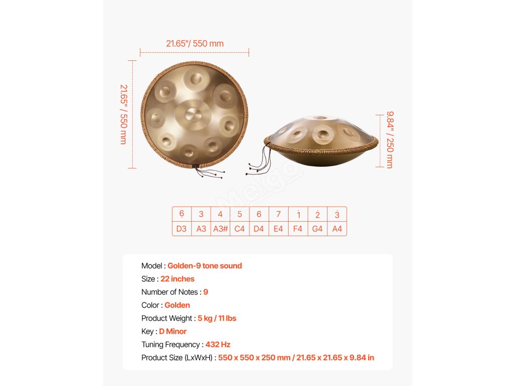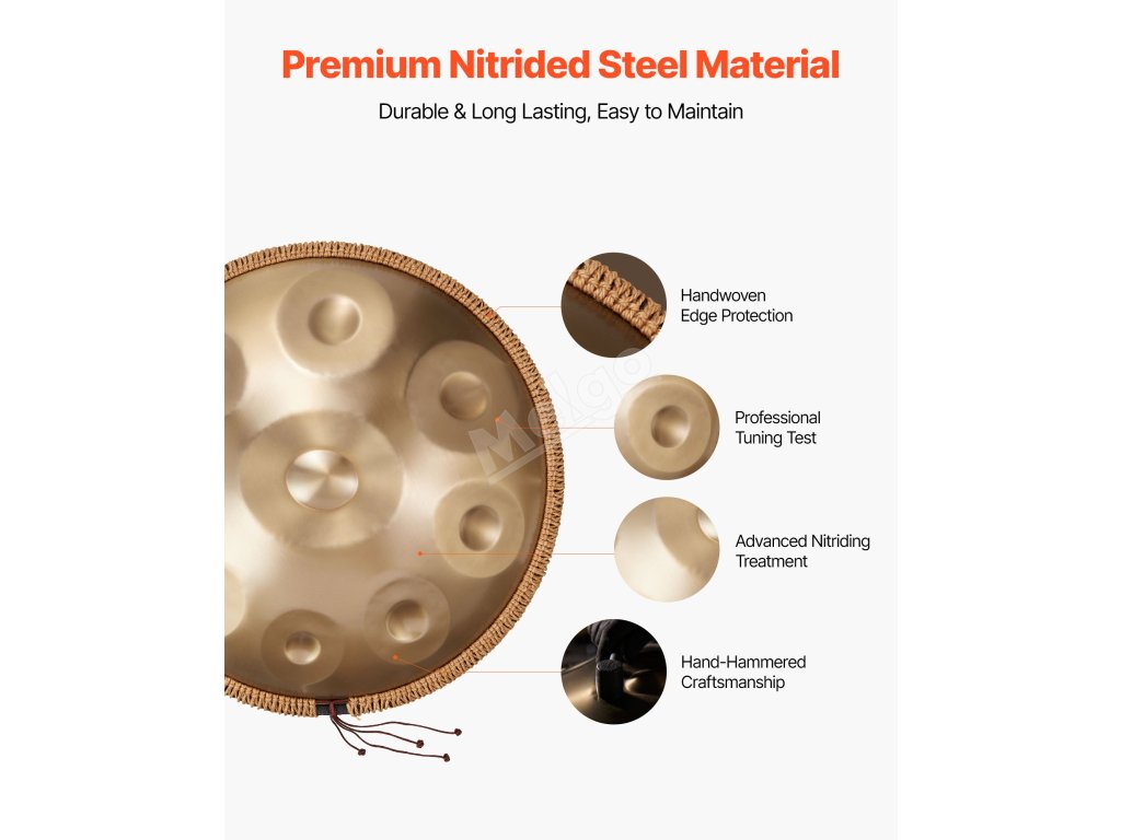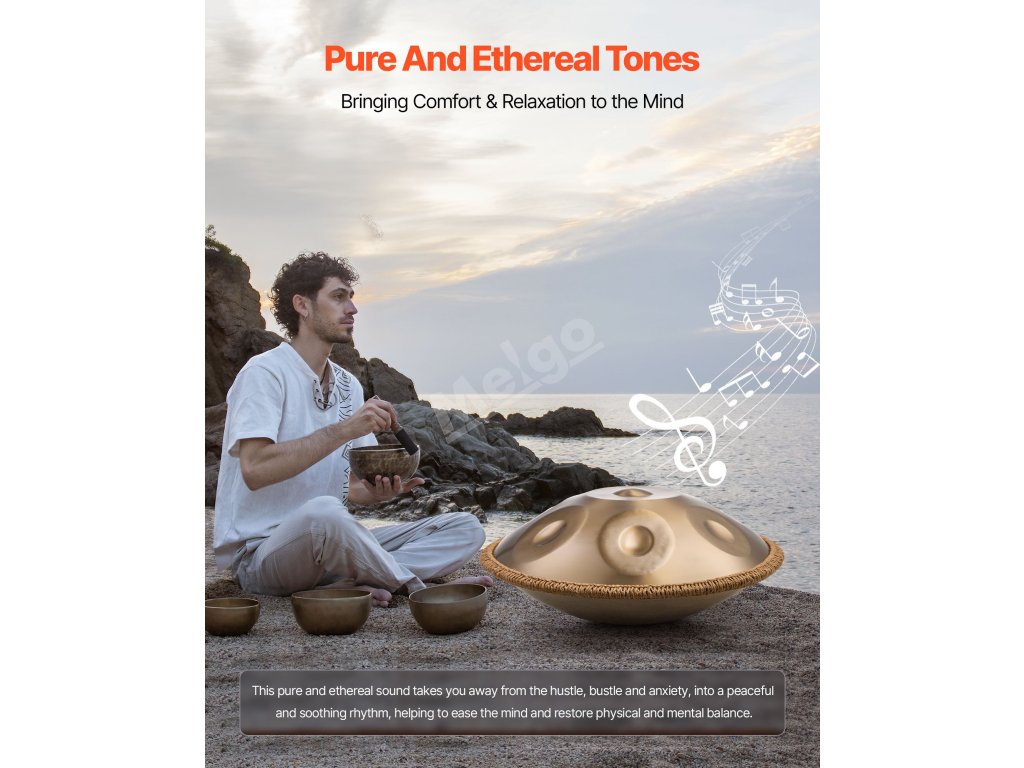 Náš buben je vyroben z nitridované oceli, která je pevná a odolná. Díky citlivé rezonanci jeho éterický a příjemný kovový rezonanční tón uklidňuje tělo i mysl, pomáhá uvolnit nervy, zmírnit stres a zlepšit emoční pohodu.