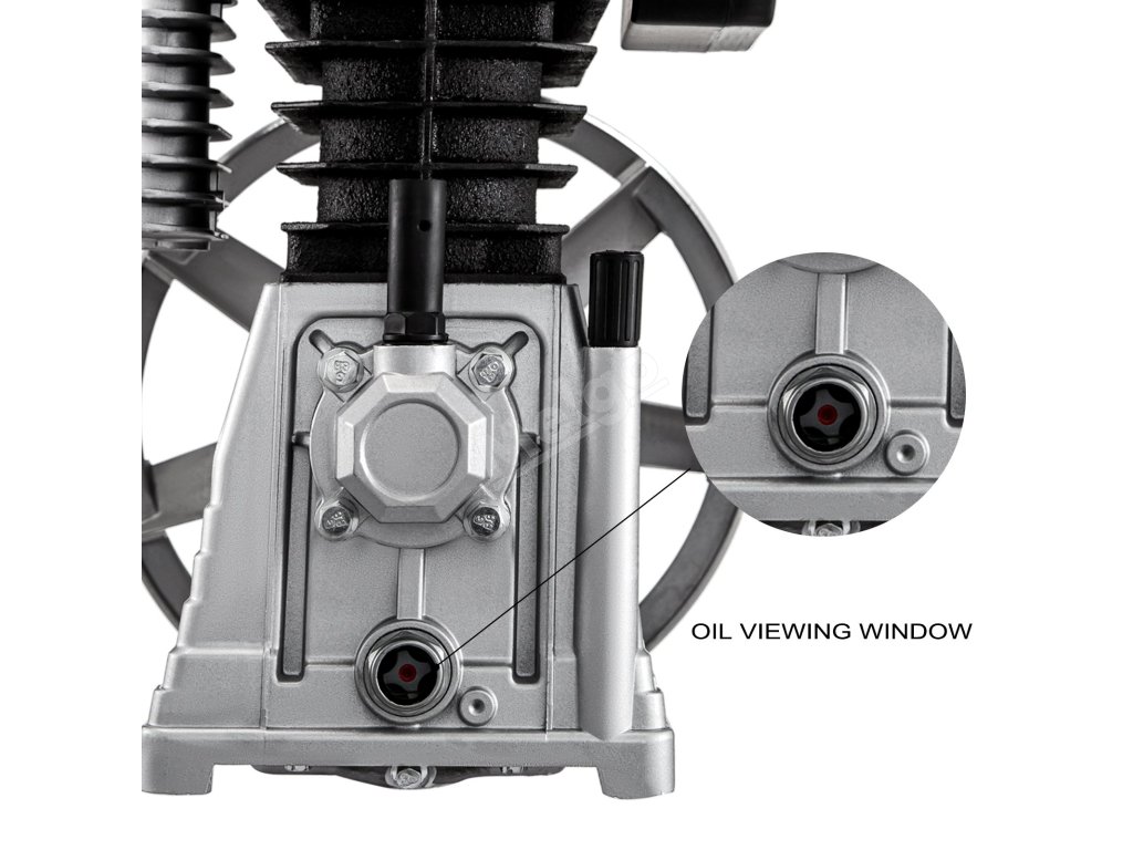 Tento vzduchový kompresor je vybaven okénkem pro kontrolu oleje a zátkou pro vypouštění oleje. Množství oleje ve stroji můžete sledovat v reálném čase. Je to pohodlné a intuitivní pozorování.
