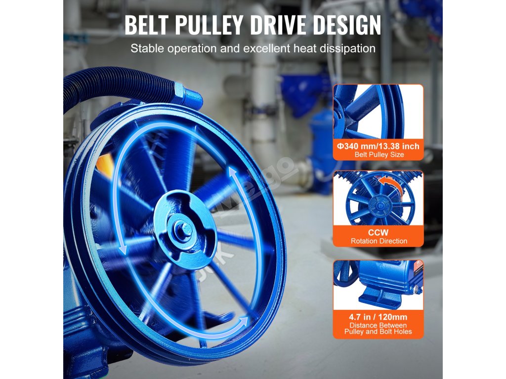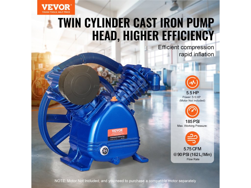 Hlava dvouválcového vzduchového kompresoru VEVOR o výkonu 5,5 HP je řešením pro vaše pneumatické potřeby. Může se pochlubit působivým průtokem vzduchu 5,75 CFM při 90 PSI, maximálním pracovním tlakem 185 PSI a dvoustupňovou kompresí, která zajišťuje stabilní a vydatnou dodávku vzduchu pro různé aplikace.