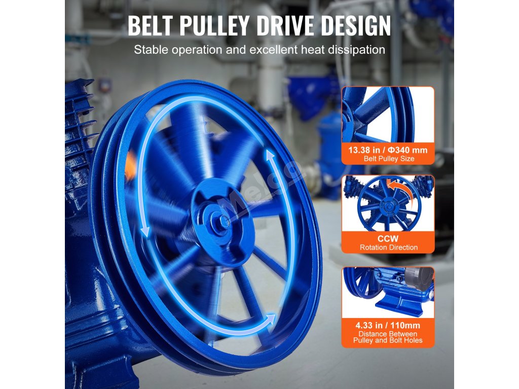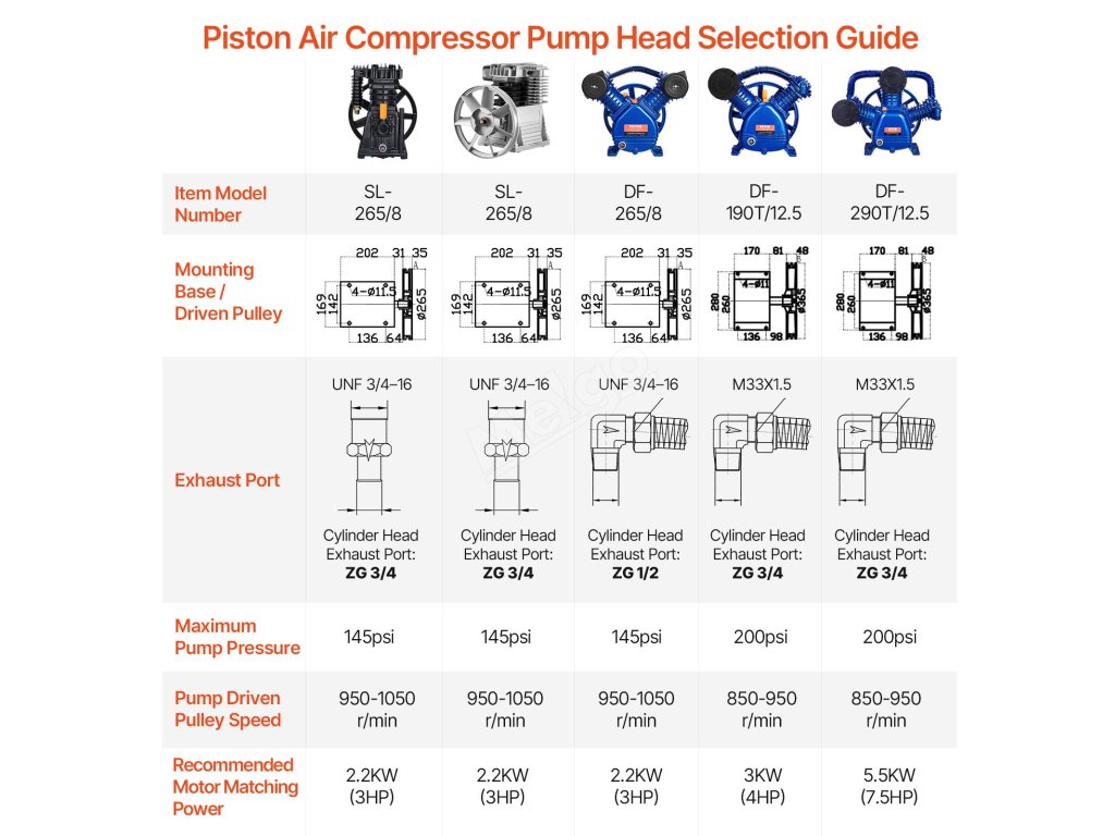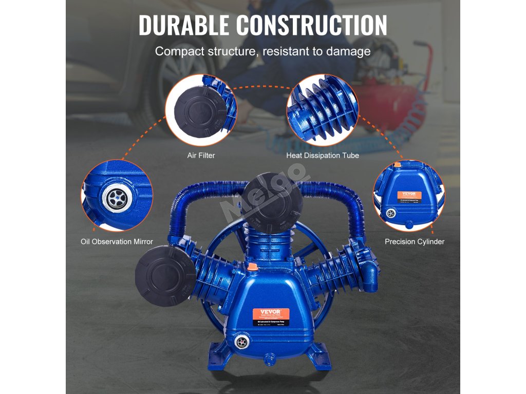 Tříválcová kompresorová hlava VEVOR s výkonem 10 HP je řešením pro vaše pneumatické potřeby. Může se pochlubit působivým průtokem vzduchu 17,5 CFM při 90 PSI, maximálním pracovním tlakem 185 PSI a dvoustupňovou kompresí, která zajišťuje stabilní a vydatnou dodávku vzduchu pro různé aplikace.