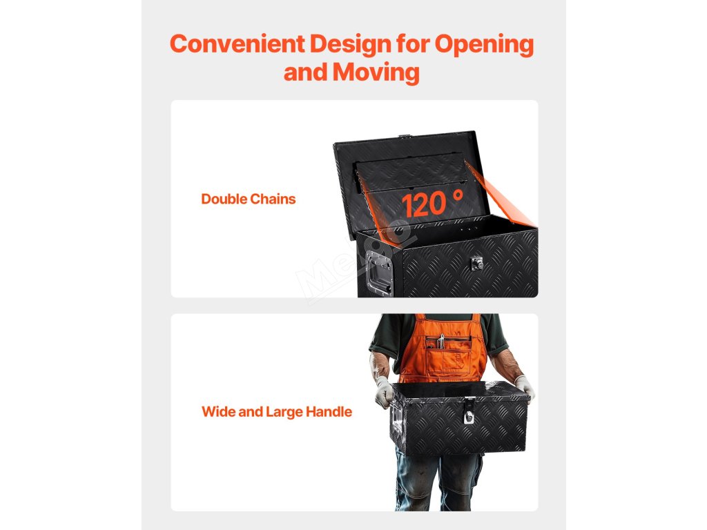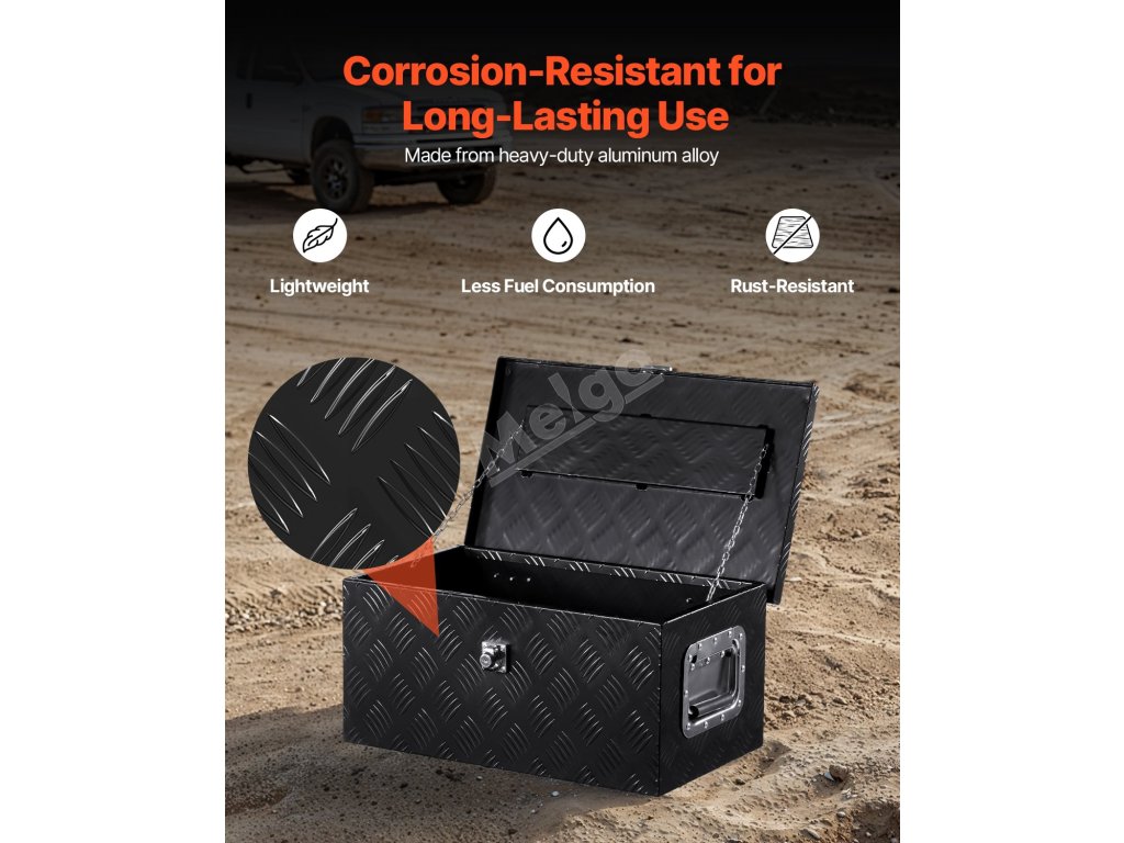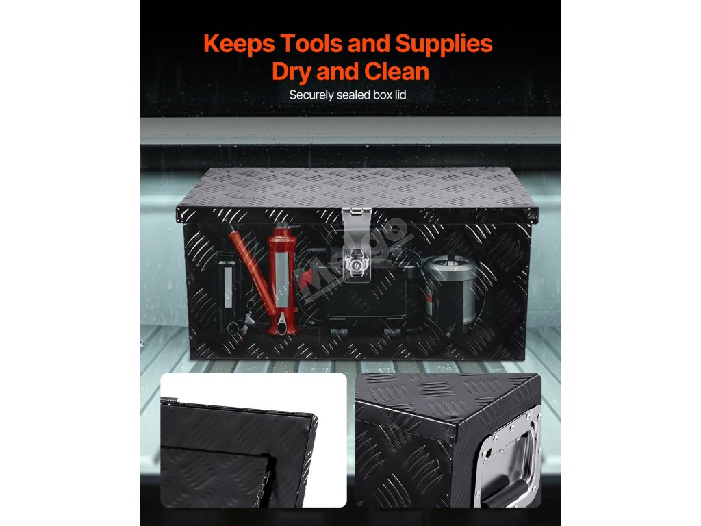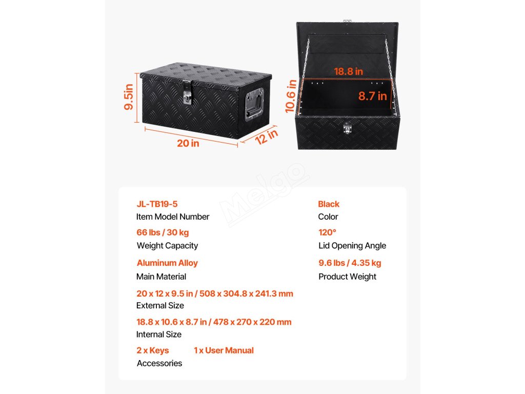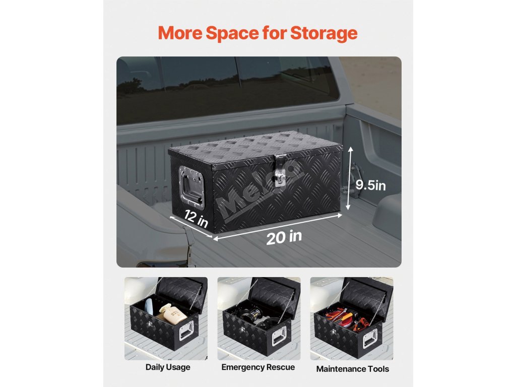 Tento box na nářadí do ložnice nákladního automobilu má vnitřní kapacitu pro uložení předmětů až do délky 18,8" (478 mm), šířky 10,6" (270 mm) a výšky 8,7" (220 mm). Pojme hmotnost 66 liber (30 kg), což vám umožní uložit předměty, jako je zvedák, různé nářadí ve vozidle, skládací stany, zavazadla a další.