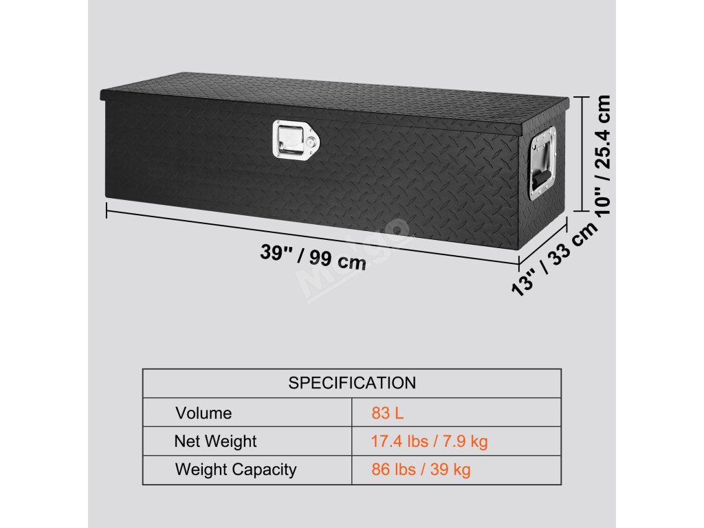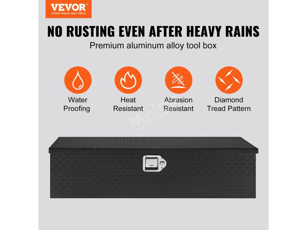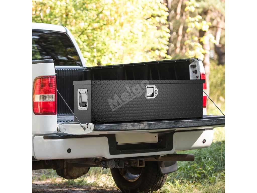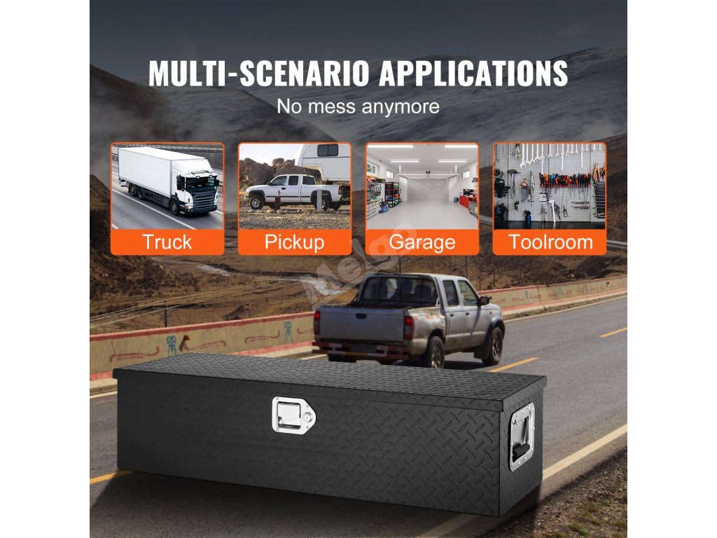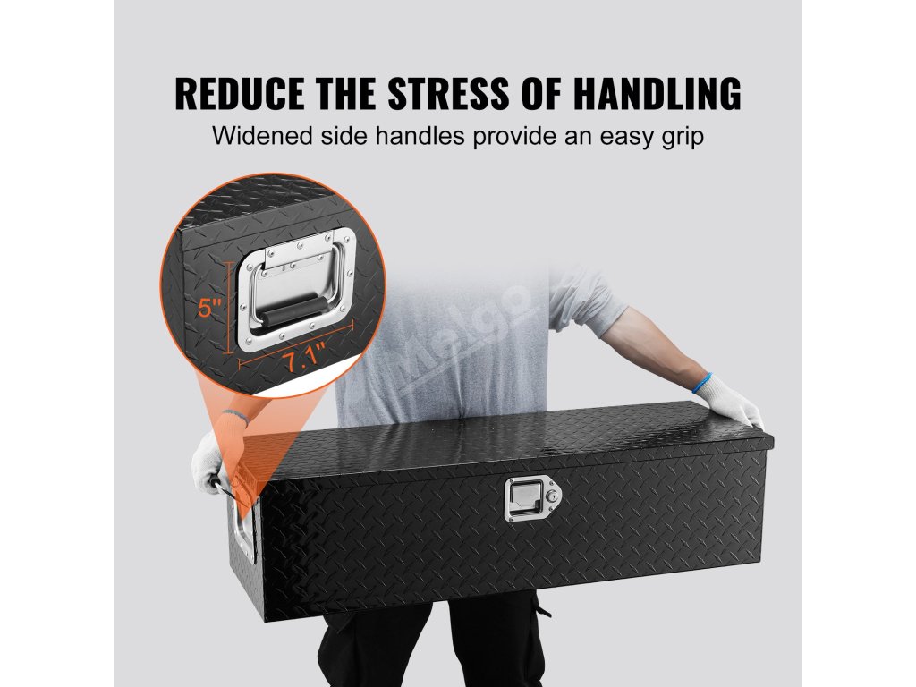 Box na nářadí je vyroben ze zesílené, vysoce kvalitní hliníkové slitiny, která je vodotěsná a odolná proti korozi. Jeho povrch s diamantovým vzorem je odolný proti opotřebení a prodloužené rukojeti usnadňují přenášení.