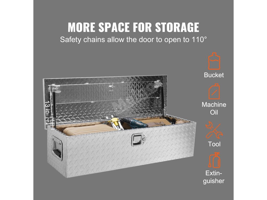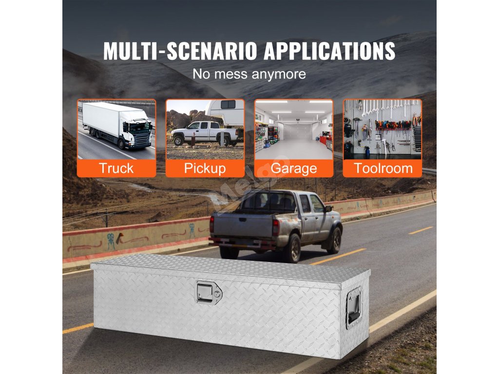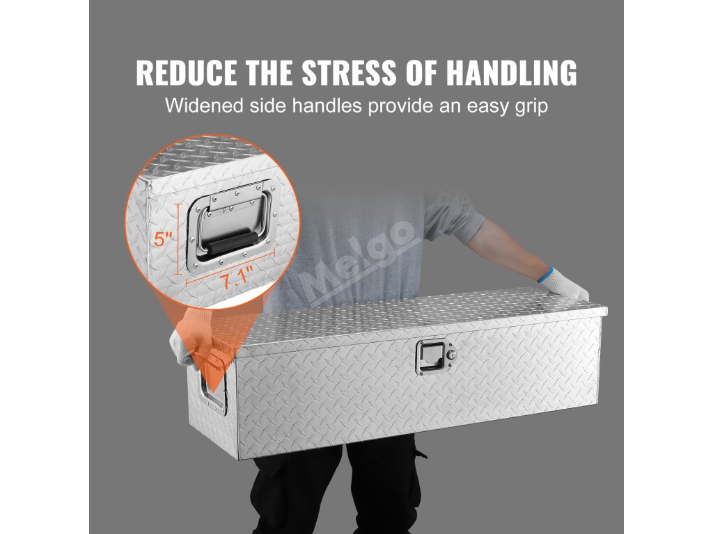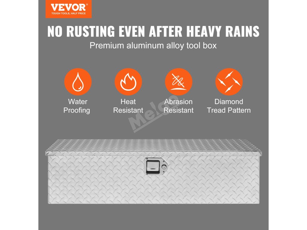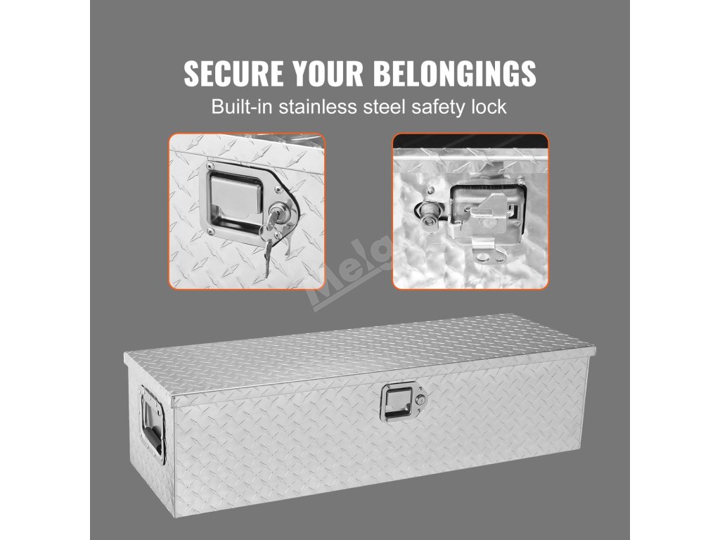 Box na nářadí je vyroben ze zesílené, vysoce kvalitní hliníkové slitiny, která je vodotěsná a odolná proti korozi. Jeho povrch s diamantovým vzorem je odolný proti opotřebení a prodloužené rukojeti usnadňují přenášení.