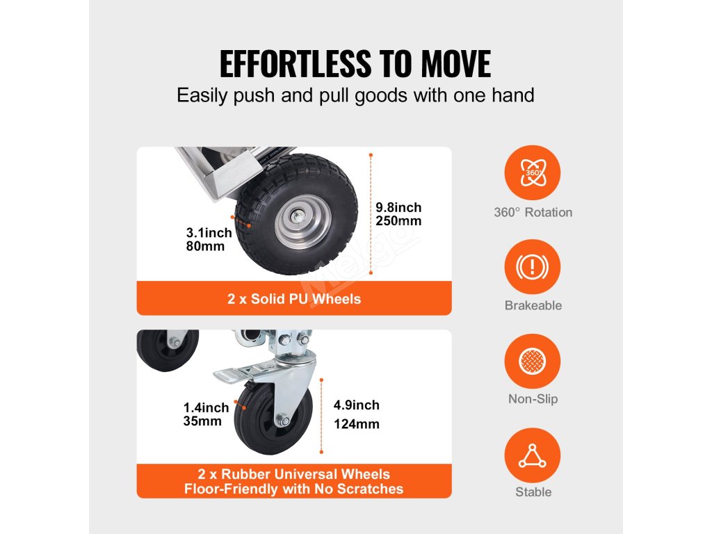 Náš ruční vozík je vybaven pevnými PU koly a univerzálními koly, která zaručují hladkou jízdu a stabilní zastavení. Jsou ideální do jakéhokoli terénu, od nerovného povrchu po travnaté kopce a betonové cesty.