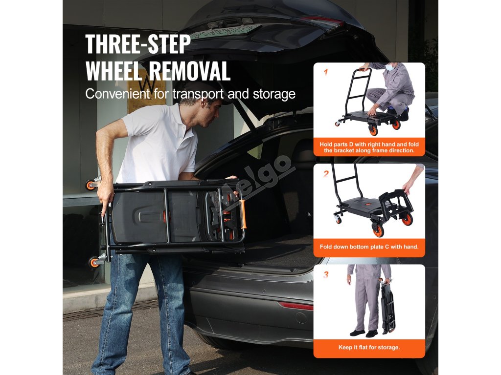 Po skončení práce tento skládací ruční vozík jednoduše složíte a uložíte do kufru. Tento šetřič místa vám bude k dispozici, kdykoli ho budete potřebovat, ať už budete nakupovat potraviny nebo přenášet hory.