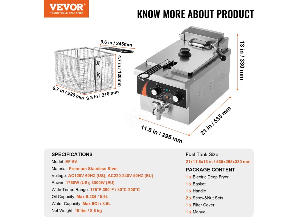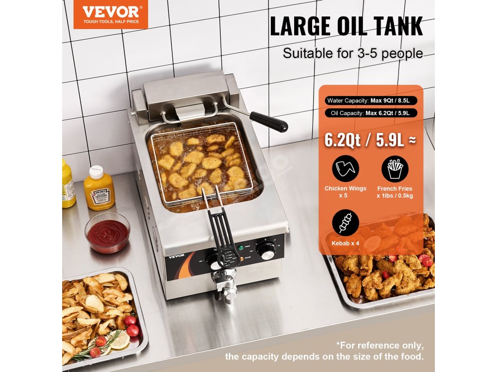 Tato komerční elektrická fritéza umožňuje smažit různé druhy potravin. Kapacita vody: 9Qt/8,5 l, kapacita oleje: max. 6,2Qt/5,9L.