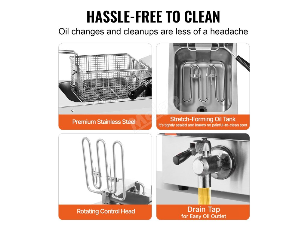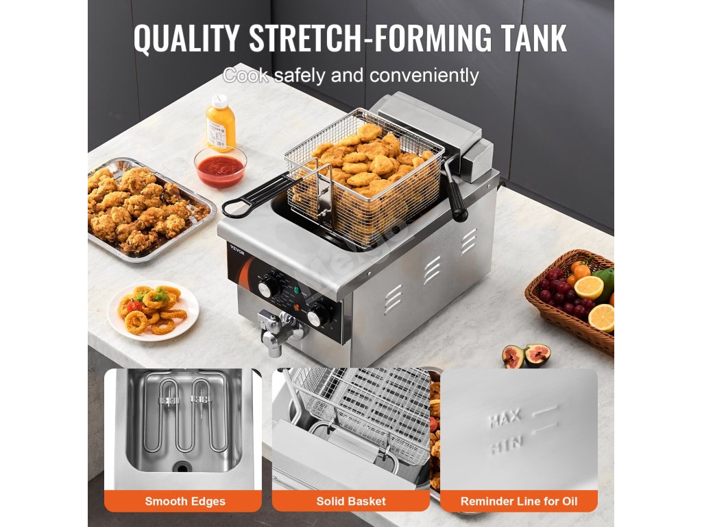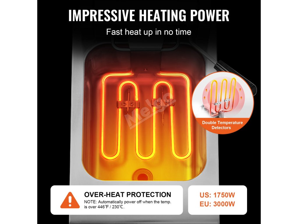 Tato komerční elektrická fritéza je vybavena výkonným topným tělesem, které rychle zahřeje olej na požadovanou teplotu a zajistí rychlé a důkladné vaření.