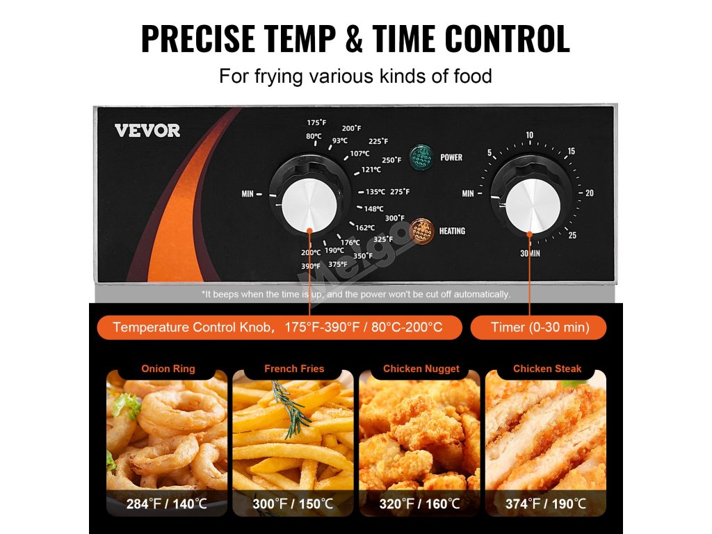 Teplotu můžete snadno nastavit v rozmezí 80-200 °C (175°F až 390°F). Fritéza se automaticky vypne, pokud teplota překročí 230 °C (446 °F) nebo pokud dojde k poruše regulátoru teploty. Je také vybavena časovačem, který vám to připomene.