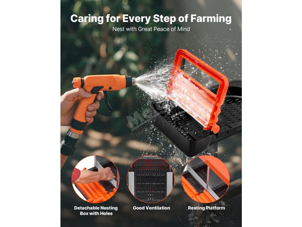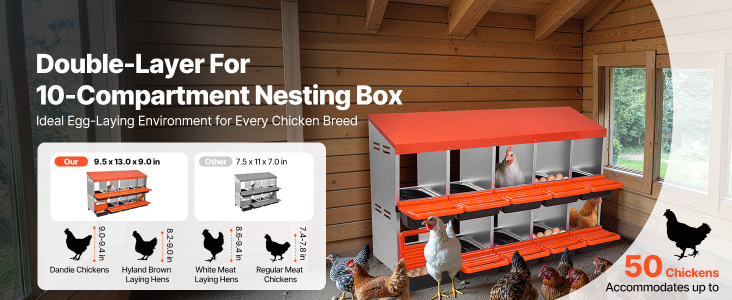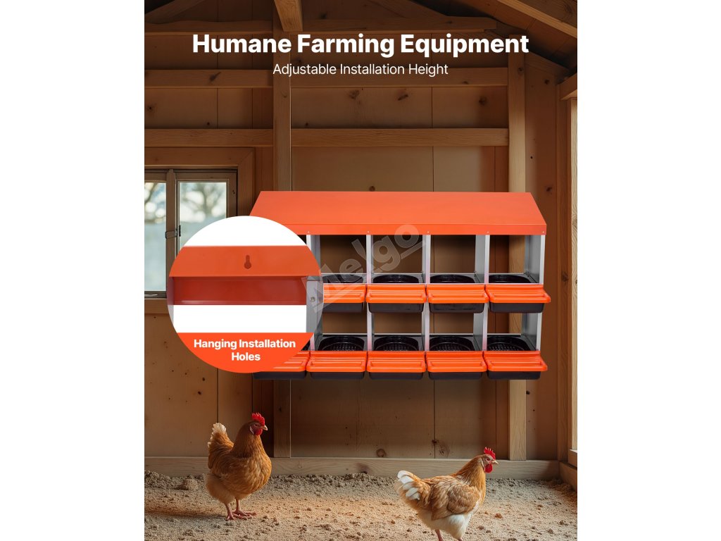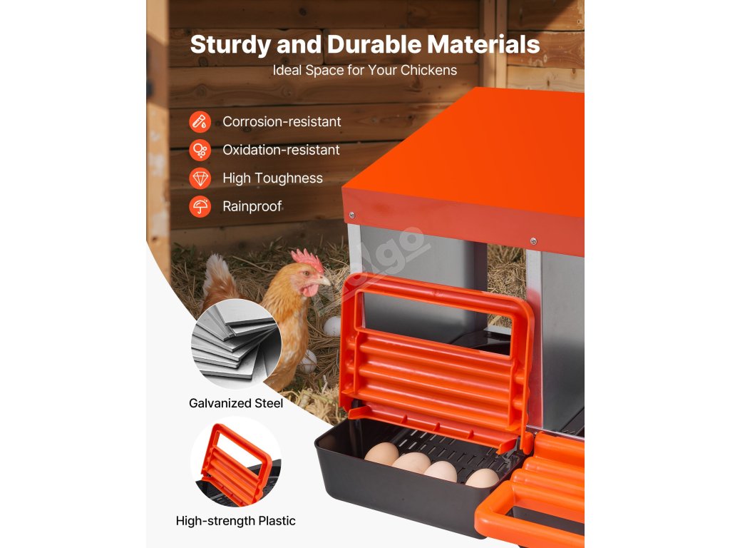 Tyto hnízdní budky pro kuřata jsou vyrobeny z robustního pozinkovaného ocelového rámu a vyztužených plastových dílů, takže jsou odolné vůči vlhkosti a drsným venkovním podmínkám. Poskytují odolnost proti korozi a dlouhou životnost pro efektivní péči o drůbež.