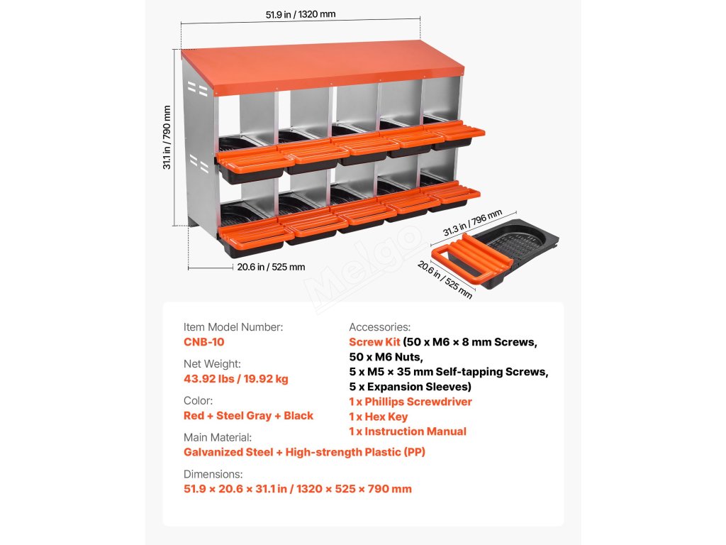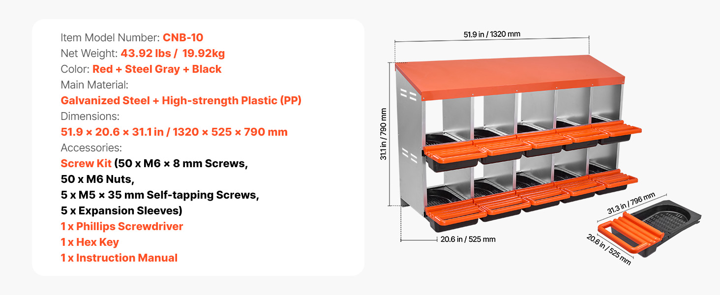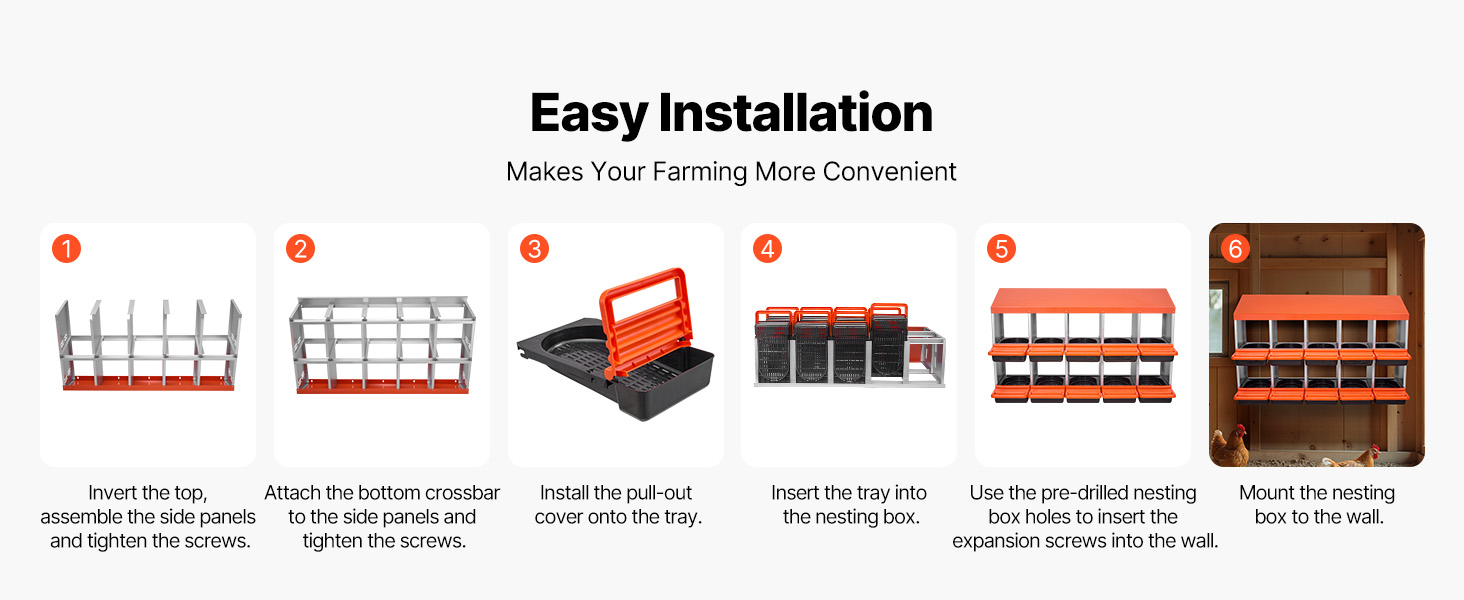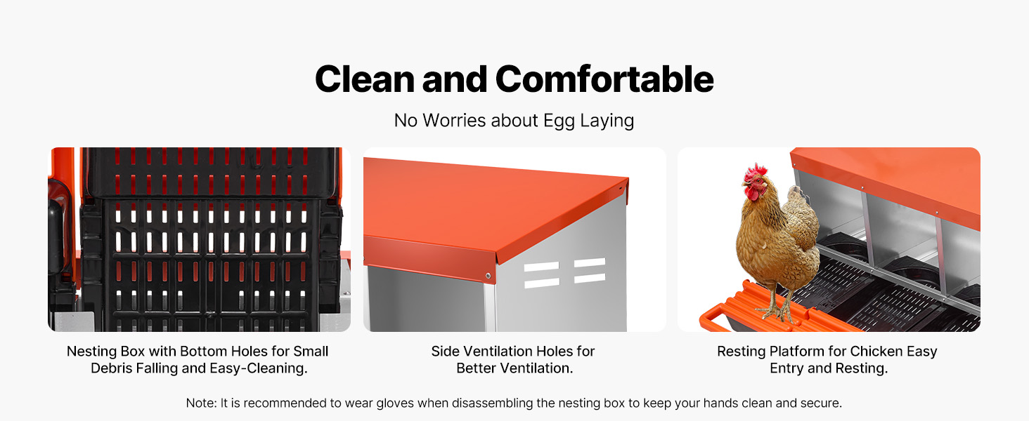 Tyto hnízdní budky pro kuřata jsou vyrobeny z robustního pozinkovaného ocelového rámu a vyztužených plastových dílů, takže jsou odolné vůči vlhkosti a drsným venkovním podmínkám. Poskytují odolnost proti korozi a dlouhou životnost pro efektivní péči o drůbež.