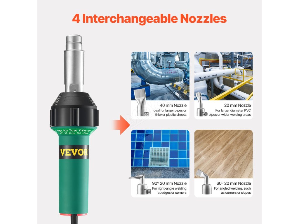 Horúcovzdušná zváracia pištoľ VEVOR na plasty ponúka 4 veľkosti trysiek - ideálne na presné zváranie PVC rúr aj na rozsiahle práce, ako sú opravy plachiet. Ľahko prepínajte medzi tryskami, aby ste zvládli akúkoľvek úlohu, ktorá vám príde do cesty.