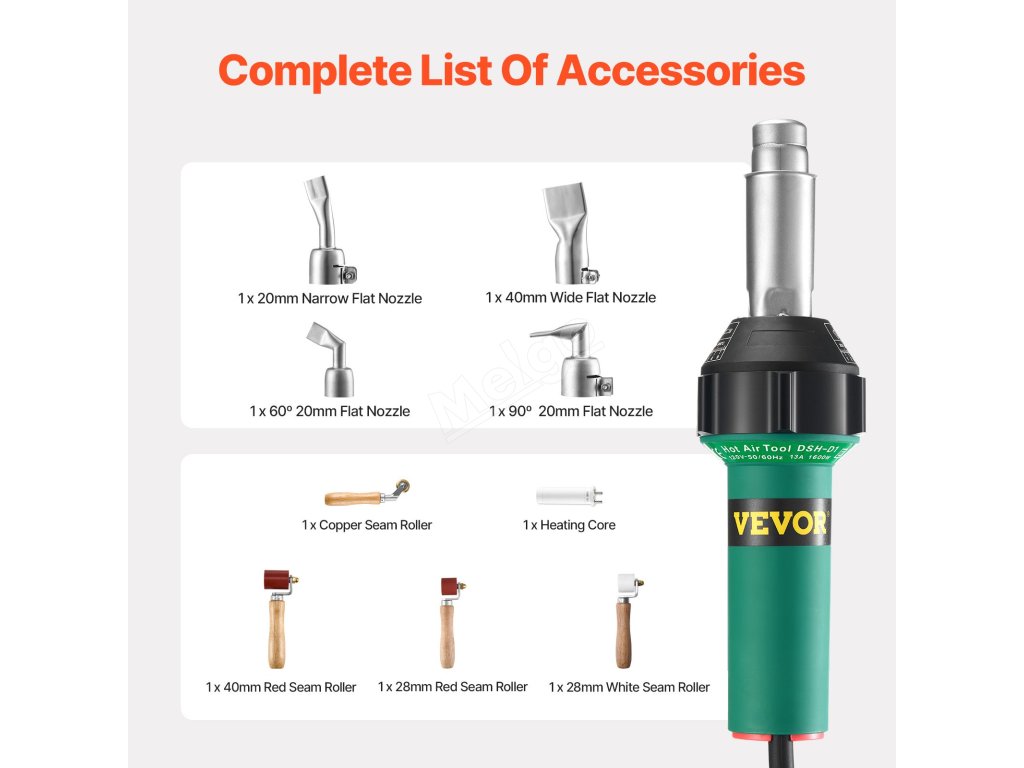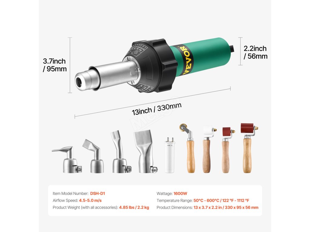 Horúcovzdušná zváračka plastov VEVOR je vybavená 1600W výkonným motorom z čistej medi, ktorý zabezpečuje rýchle zahrievanie na efektívne zváranie. Obsahuje sadu profesionálnej súpravy na zváranie plastov (s 9 kusmi príslušenstva). Vďaka 9-stupňovej regulácii teploty, účinnému chladeniu a dlhému napájaciemu káblu je ideálna pre začiatočníkov aj profesionálov.