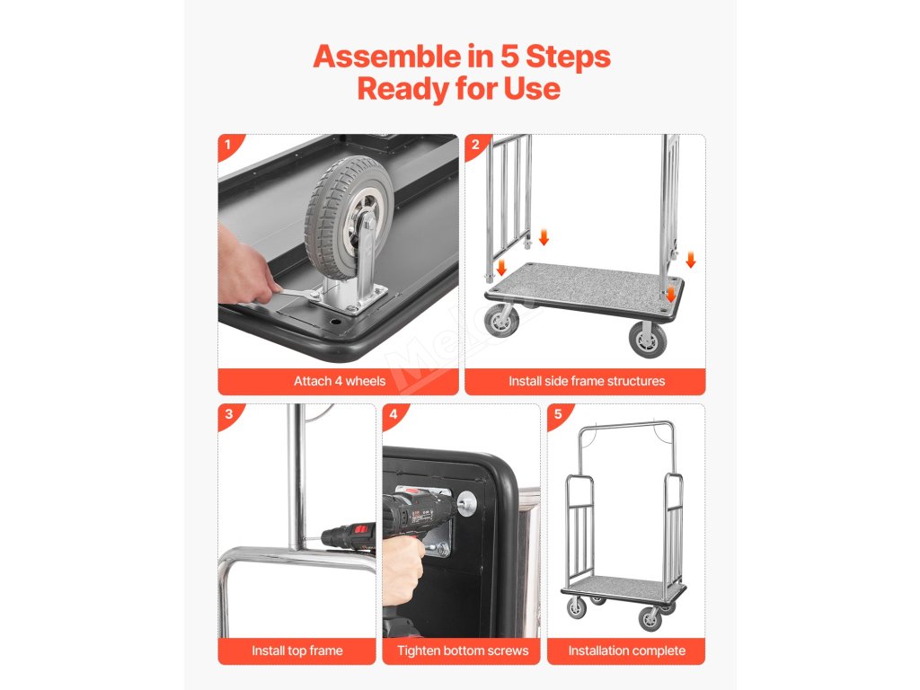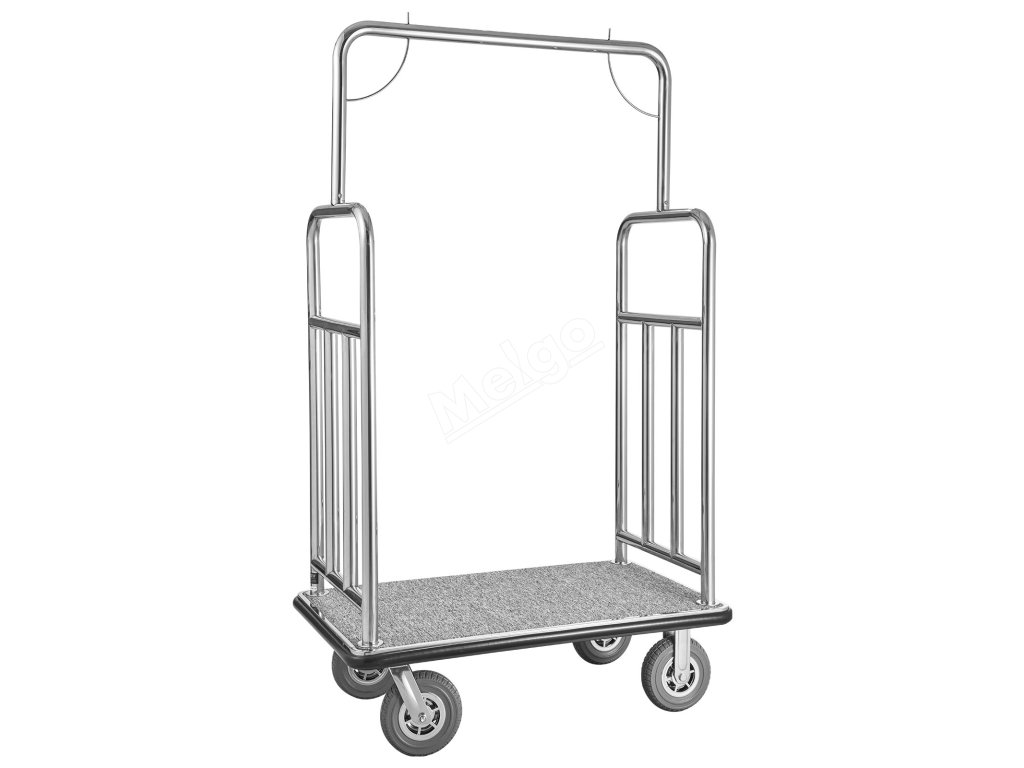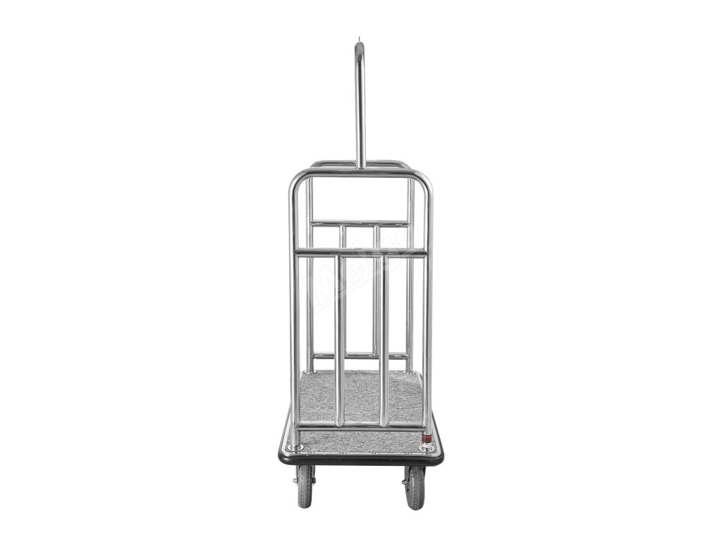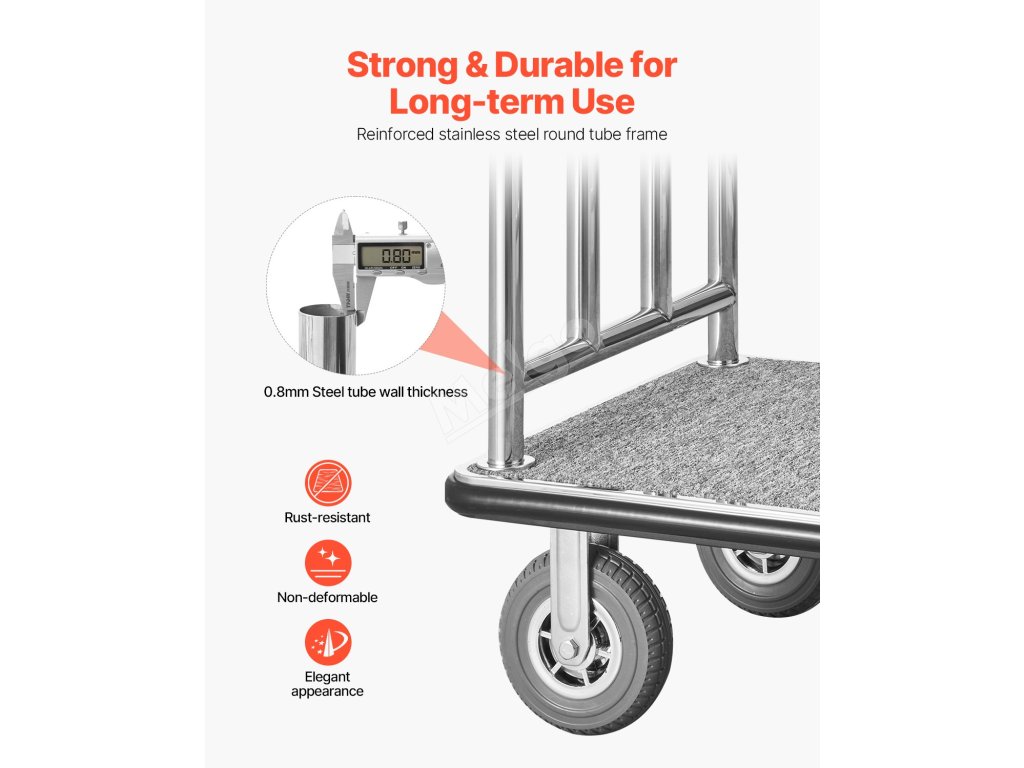 Tento hotelový vozík na zavazadla je vyroben z 1 mm silného rámu z nerezové oceli, který mu umožňuje zachovat si lesk. Odolná základna a čtyři 8palcová gumová kola zajišťují hladký a stabilní pohyb i při plném zatížení.
