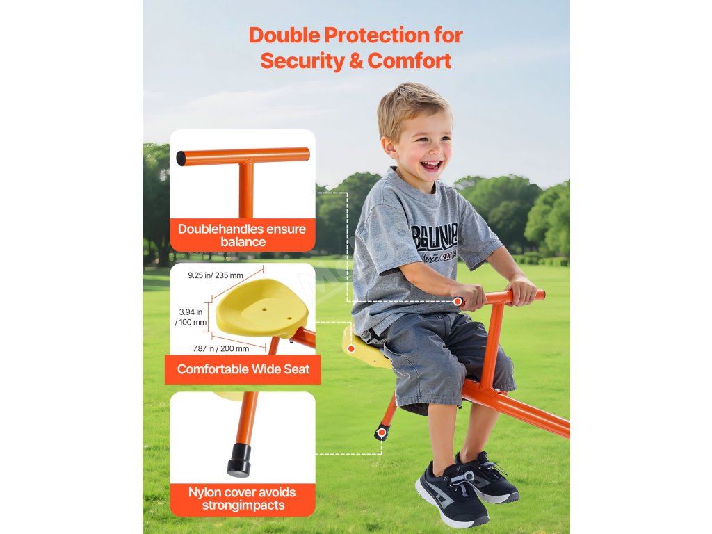 Každé sedadlo je vyrobeno z odolné uhlíkové oceli a unese až 100 liber/45,4 kg. Konstrukce otáčející se o 360° umožňuje dětem při otáčení skákat nahoru a dolů, což zvyšuje zábavu a vzrušení ze hry!