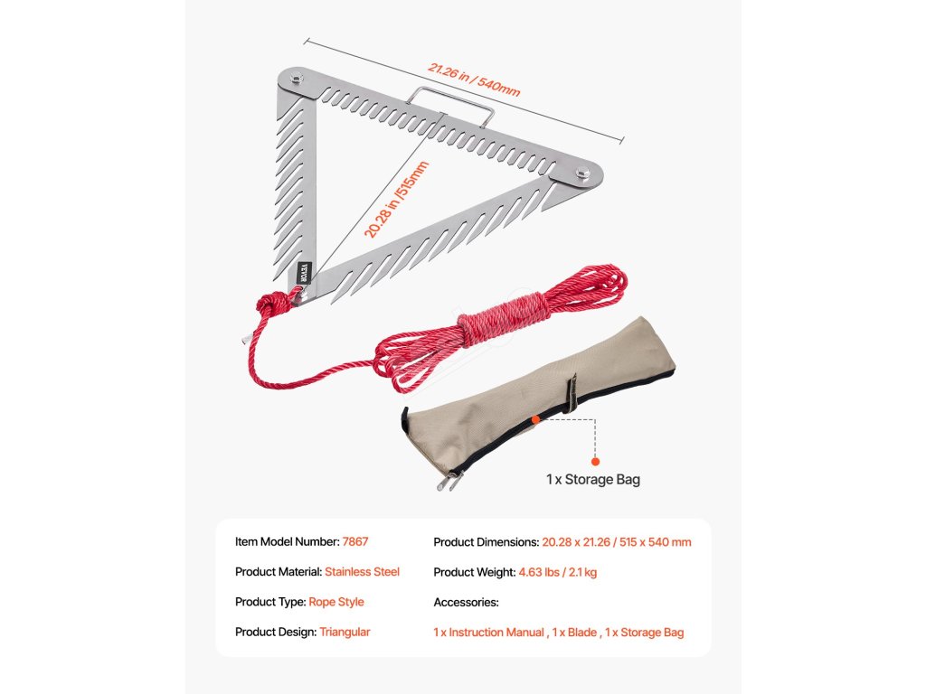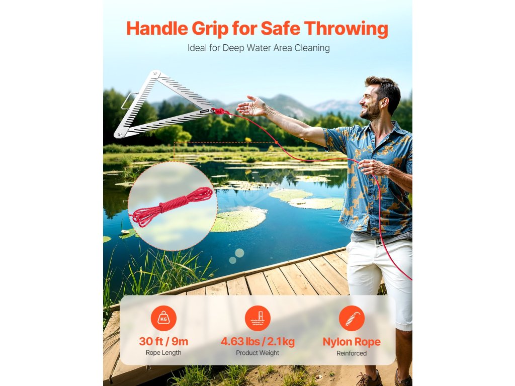 Tyto trojúhelníkové hrábě na vodu z nerezové oceli s ostrými hroty na třech stranách snadno odstraňují plevel a rychle odstraňují povrchové nečistoty. Skládací konstrukce umožňuje snadné skladování. vyztužené nylonové lano o délce 9 stop je ideální pro čištění hlubokých vod a je lehké, takže se snadno hází.